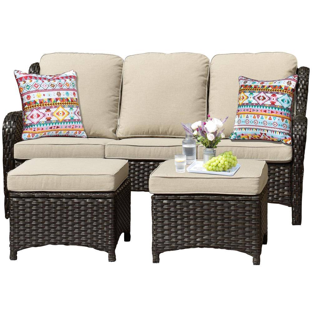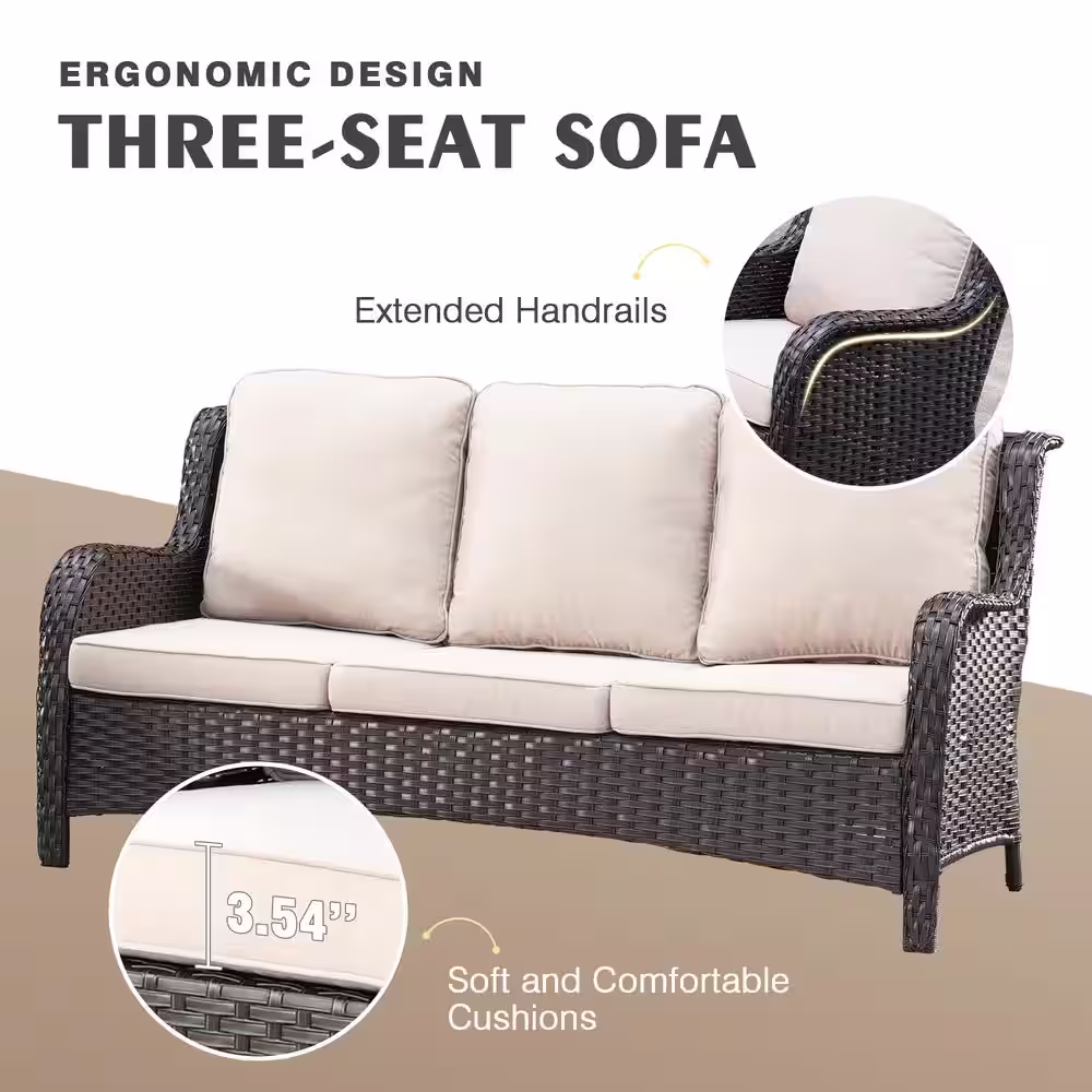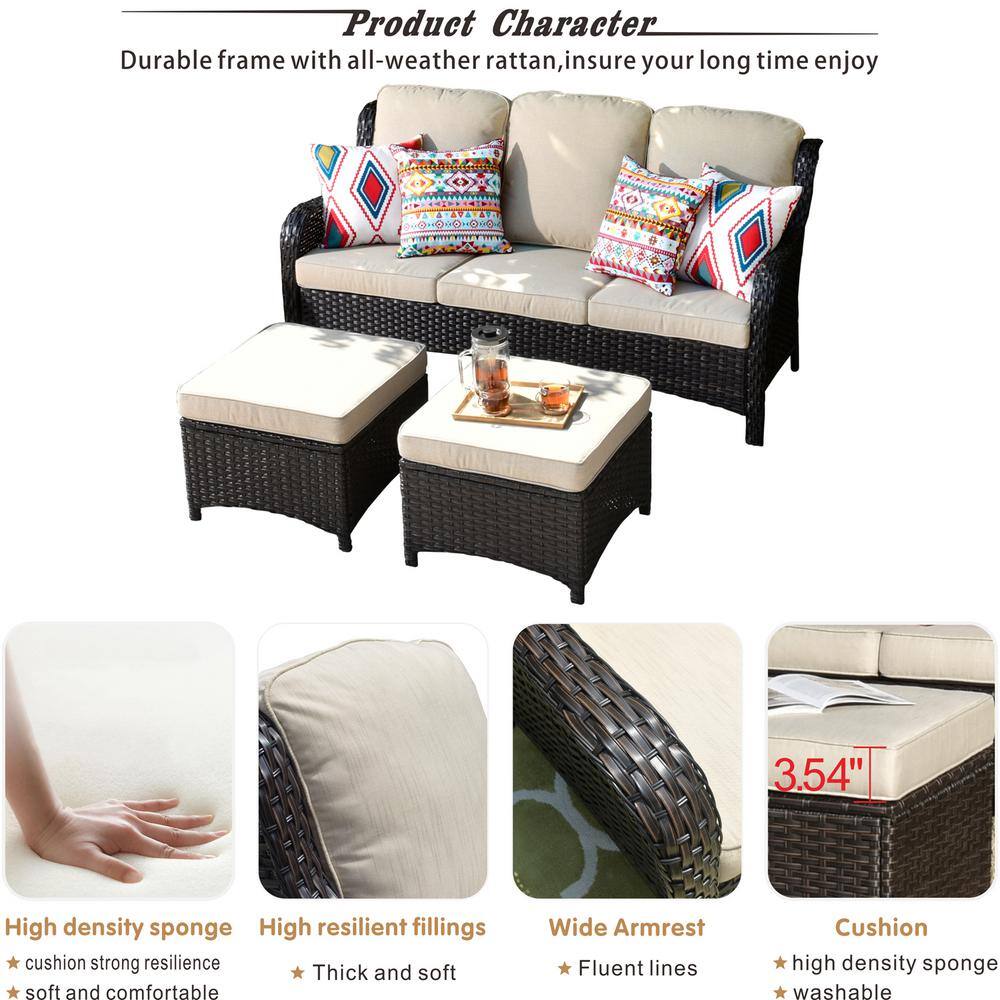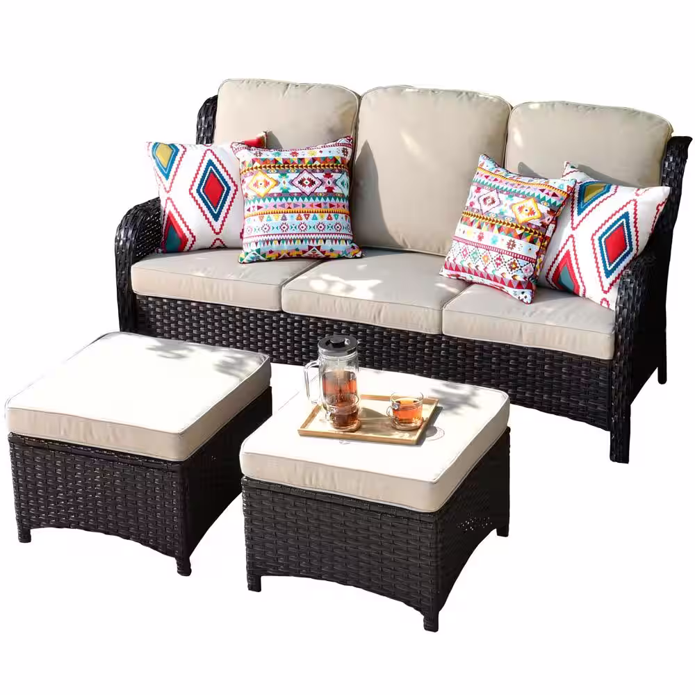 OVIOS Joyoung Brown 3-Piece Wicker outdoor Patio Sectional Conversation Seating Set with Beige Cushions