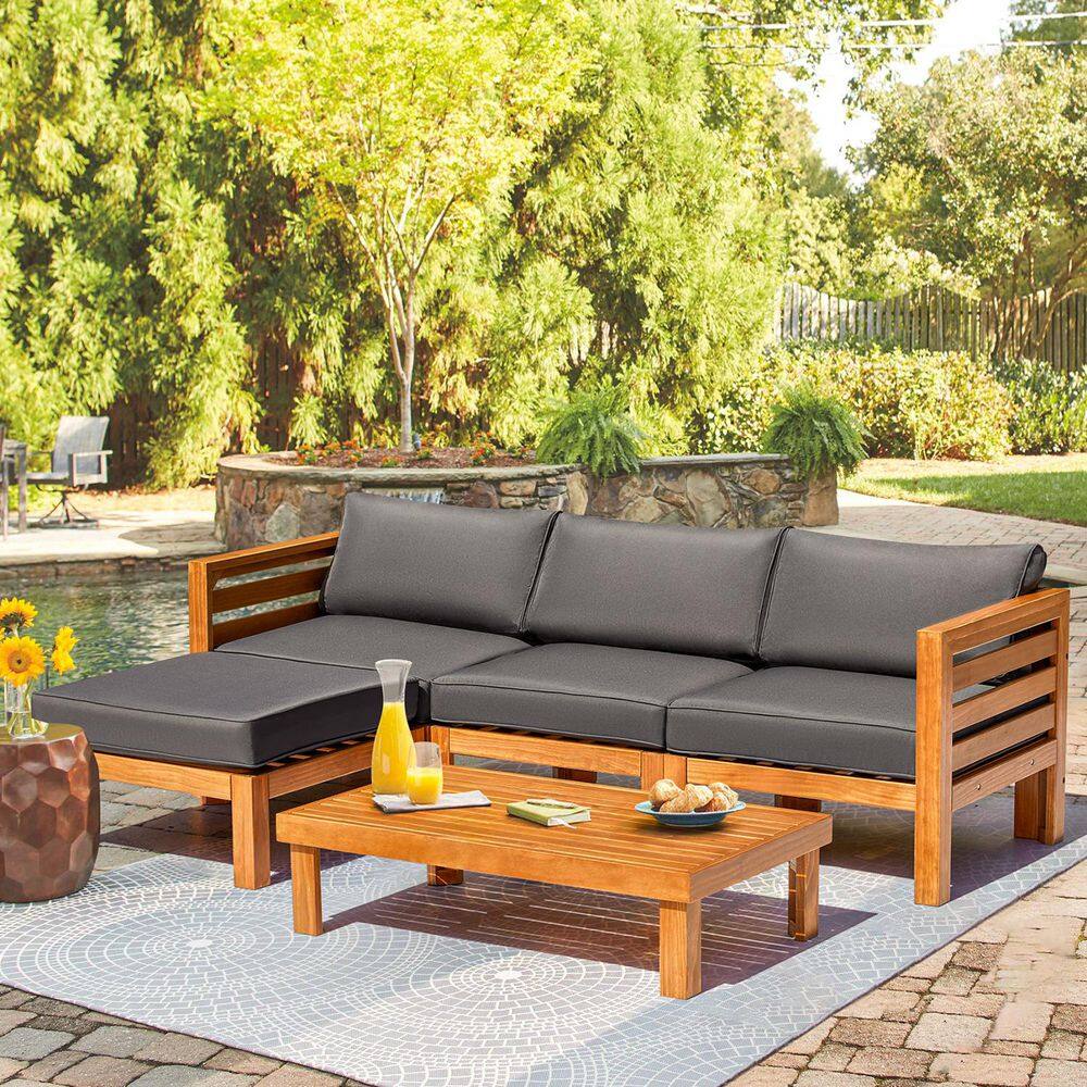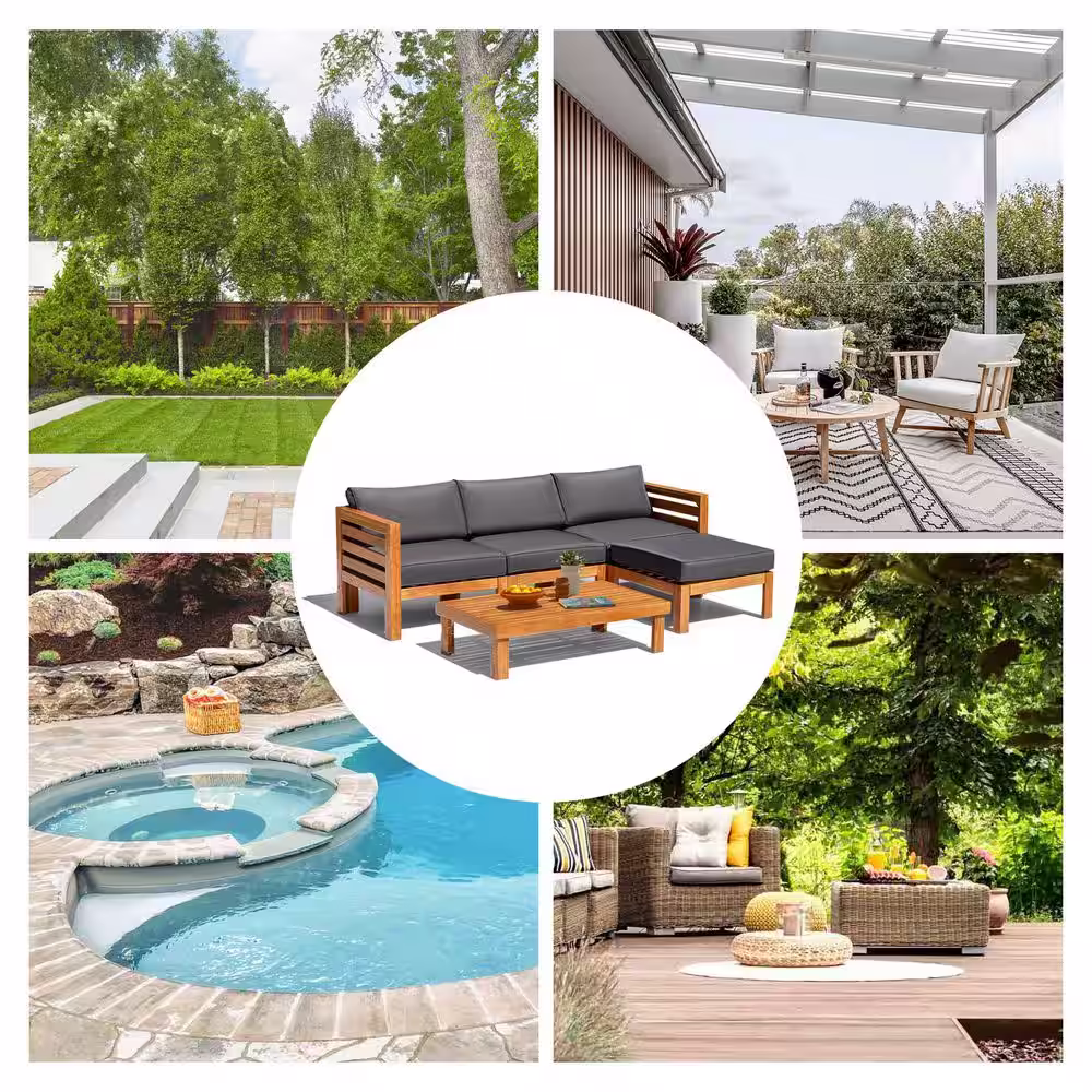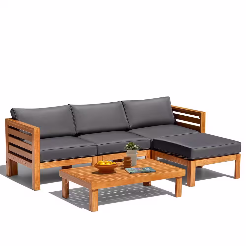 None 5-Piece Wood Patio Conversation Set with Coffee Table and Soft Dark Grey Cushions, Outdoor Sofa Set
