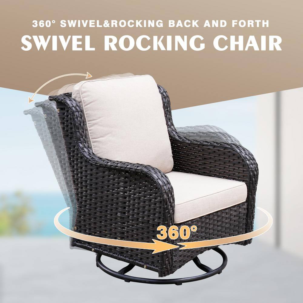 None Monet Brown 5-Piece Wicker Patio Conversation Seating Sofa Set with Beige Cushions and Swivel Rocking Chairs