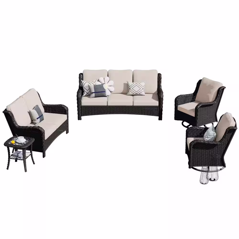 OVIOS Mercury Brown 5-Piece Wicker Patio Conversation Seating Set with Beige Cushions