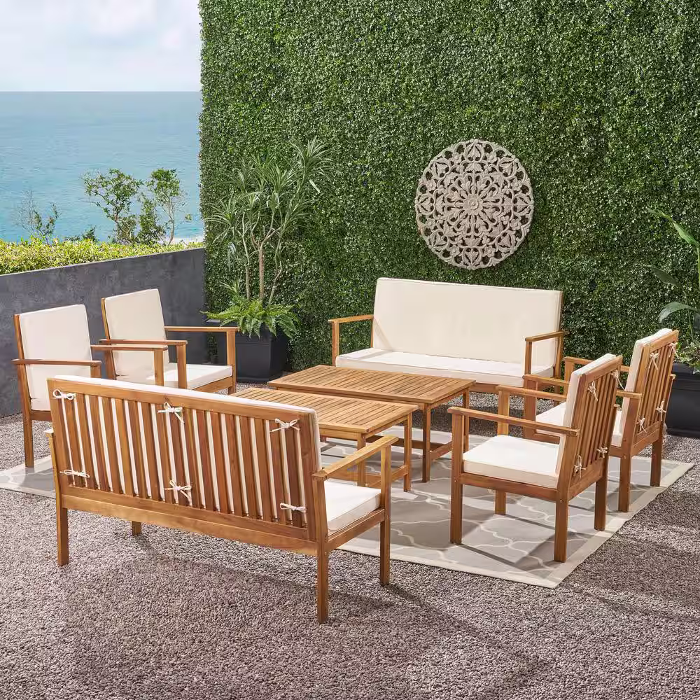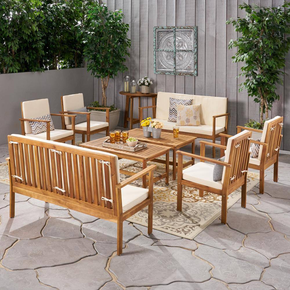 Noble House Luciano Brown Patina 8-Piece Wood Patio Conversation Seating Set with Cream Cushions