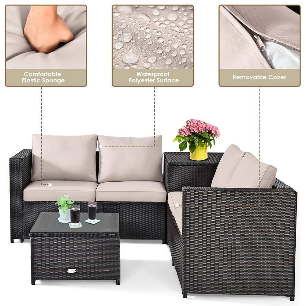 Costway Brown 4-Piece Rattan Wicker Outdoor Patio Conversation Sectional Seating Set with Brown Cushions