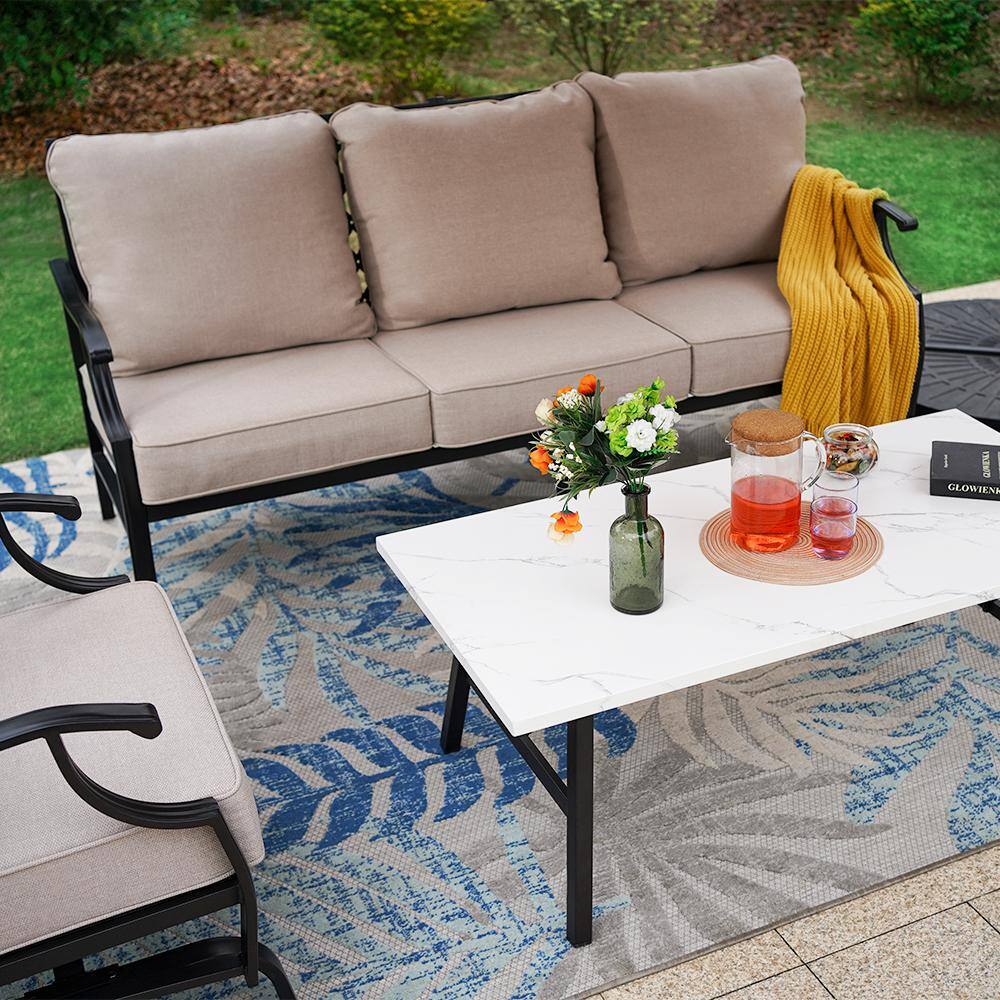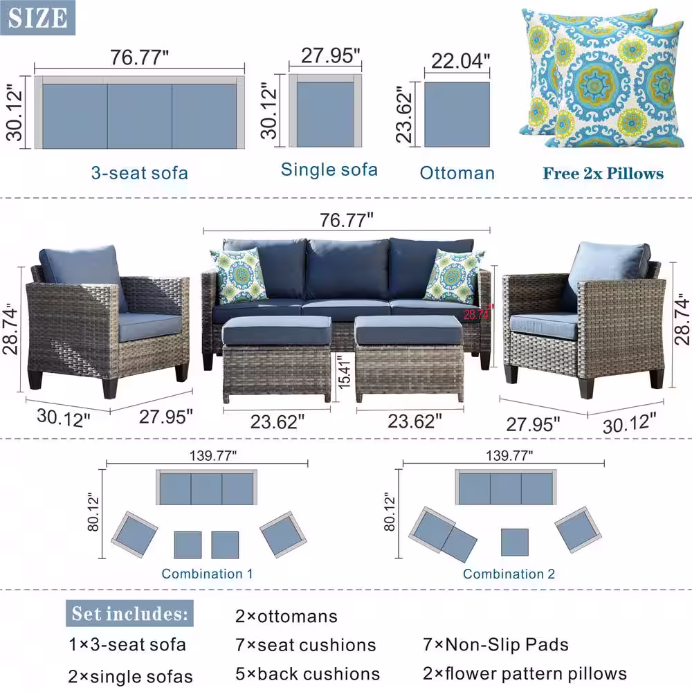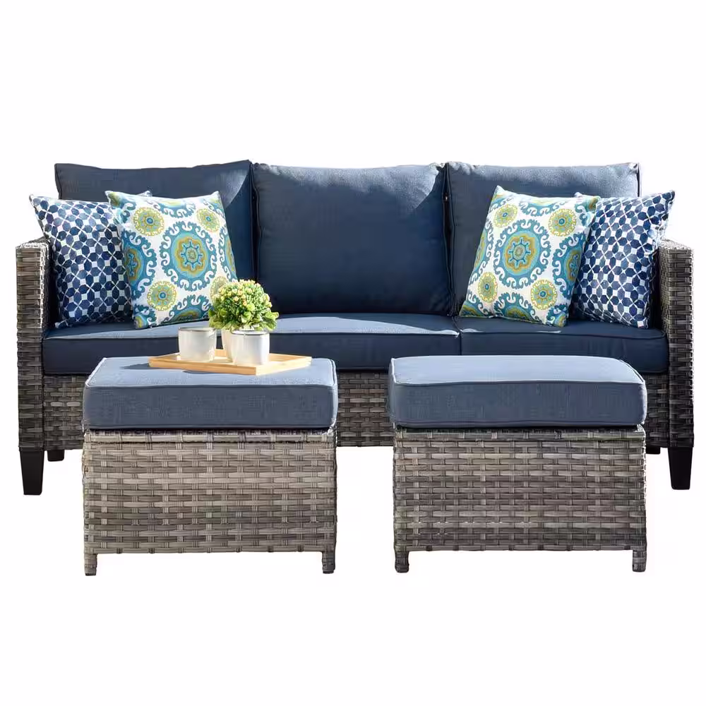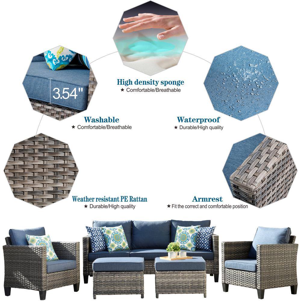 XIZZI Jupiter Gray 5-Piece Wicker Outdoor Patio Conversation Seating Sofa Set with Denim Blue Cushions