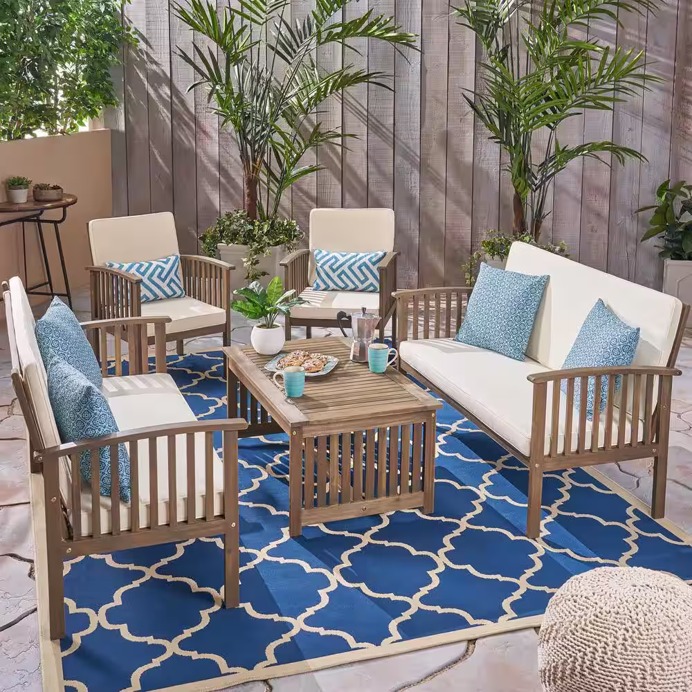 Noble House Carolina Grey 5-Piece Wood Patio Conversation Set with Cream Cushions