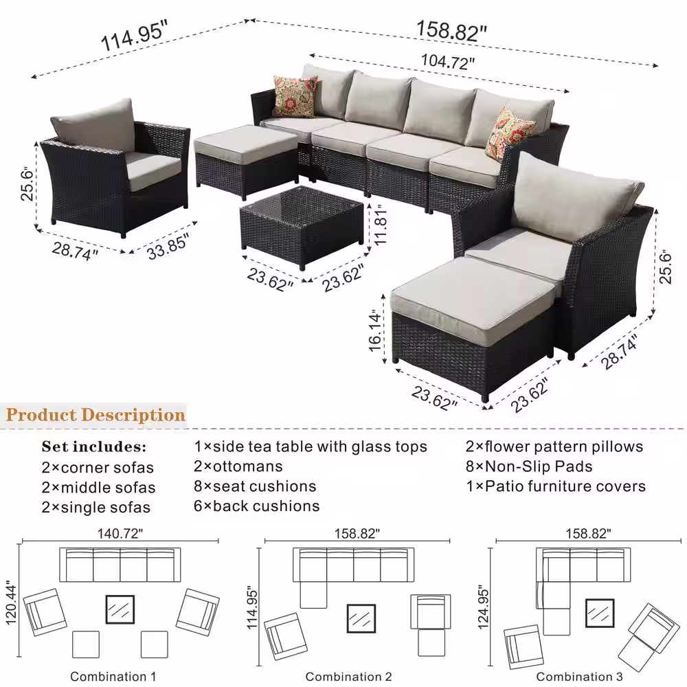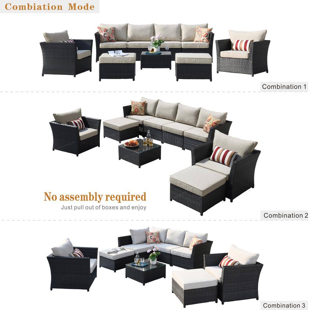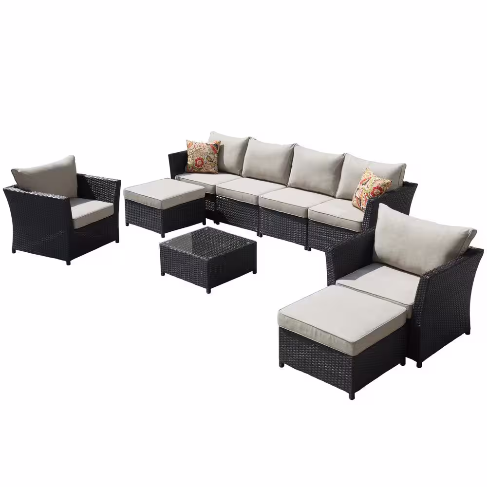 None Minerva Brown 9-Piece Wicker Outdoor Patio Conversation Sectional Sofa Set with Beige Cushions