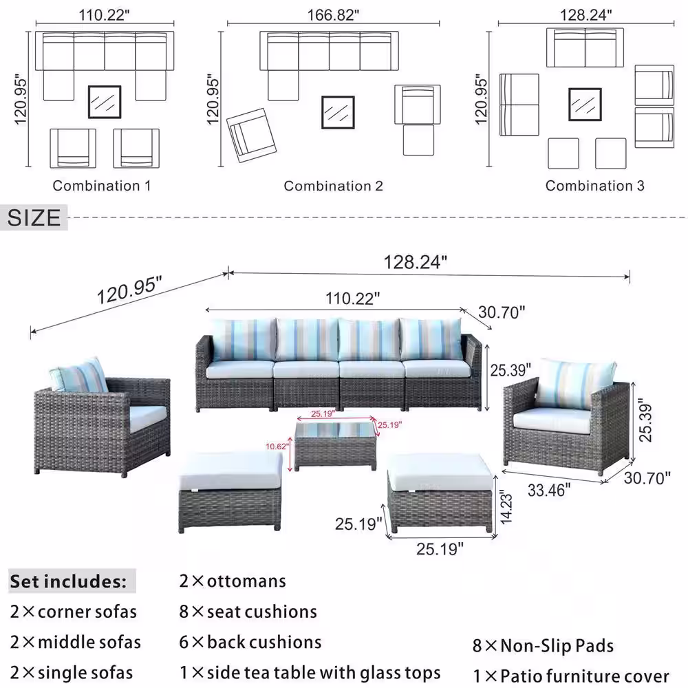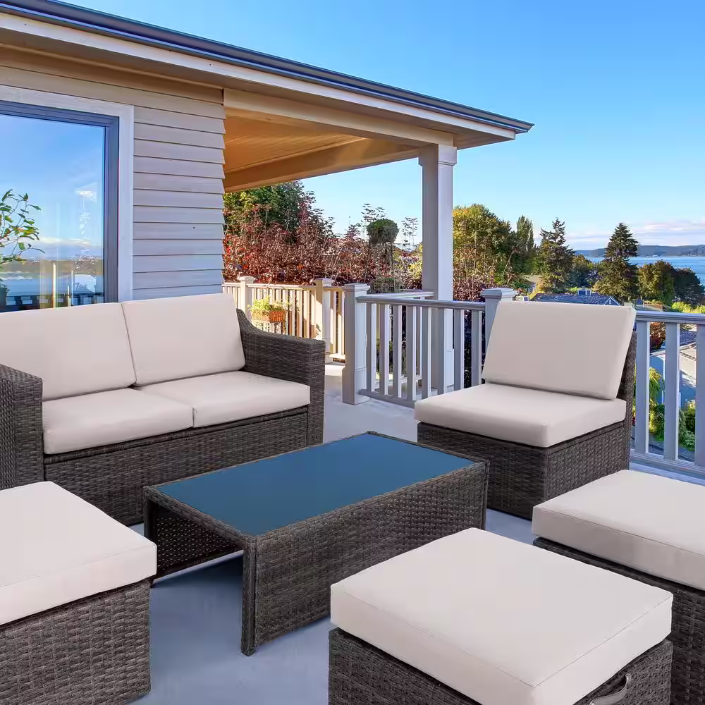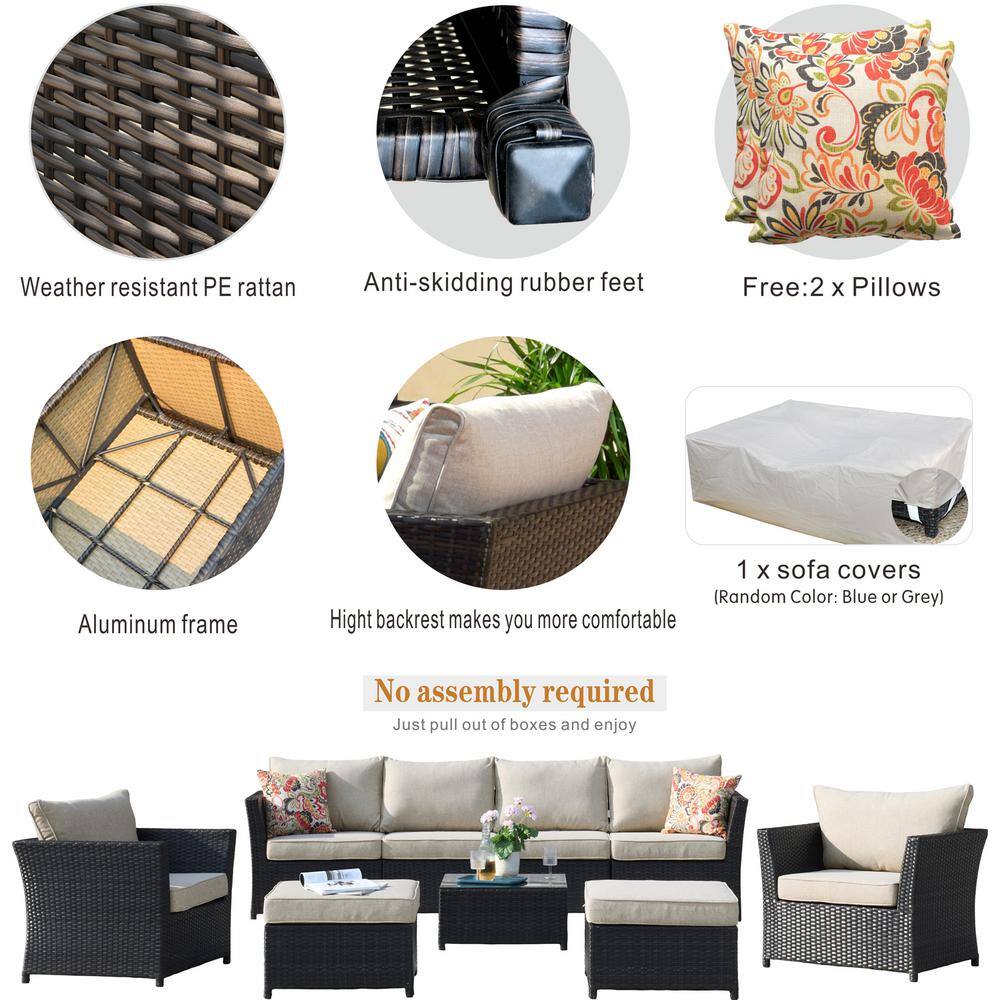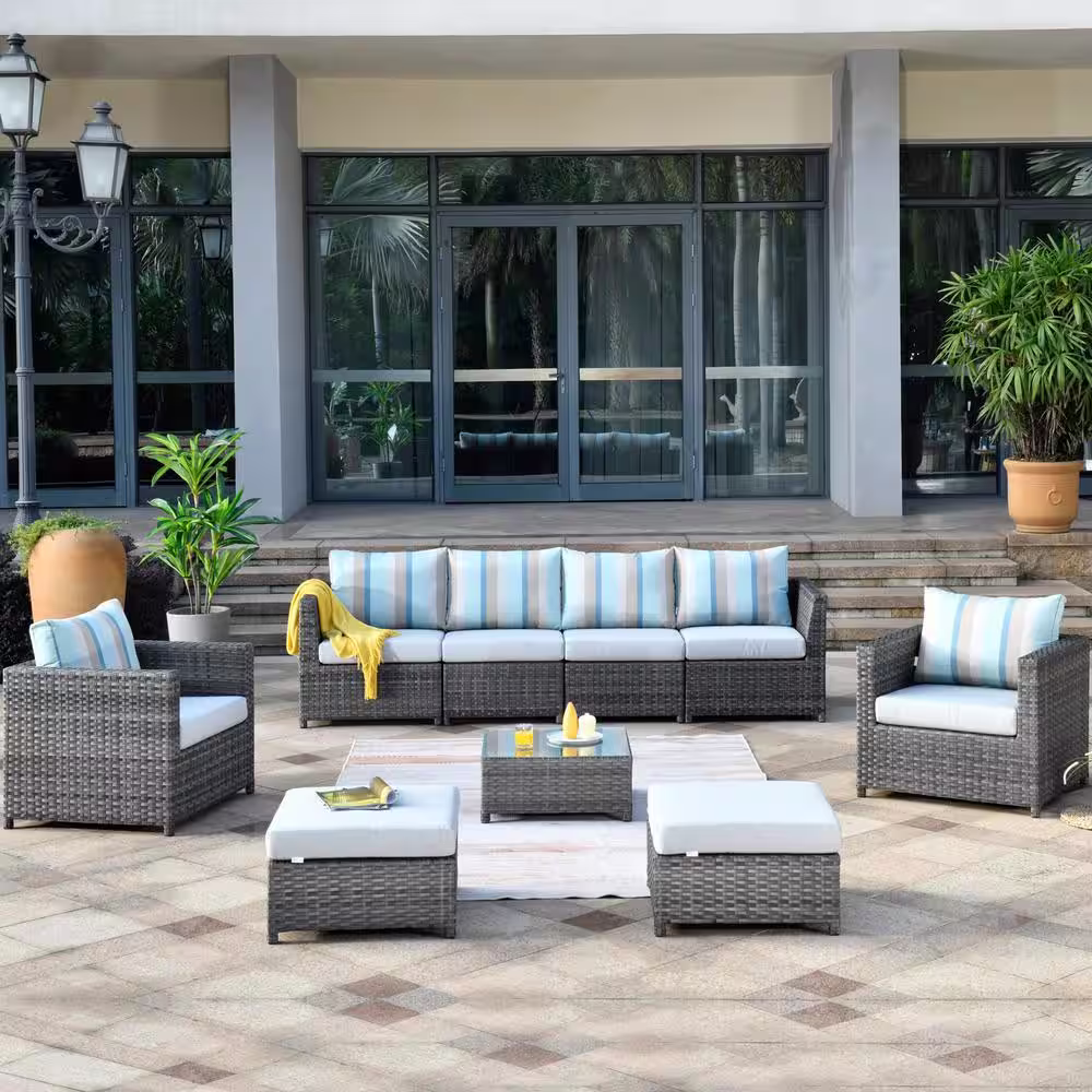 None Minerva Brown 9-Piece Wicker Outdoor Patio Conversation Sectional Sofa Set with Beige Cushions