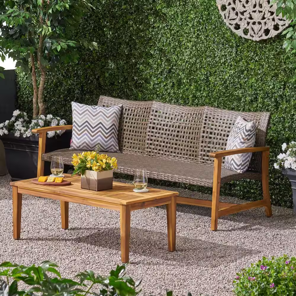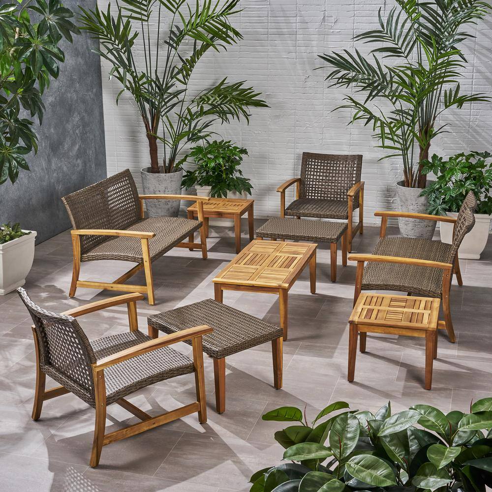 Noble House Hampton Natural 9-Piece Wood and Faux Rattan Patio Conversation Set
