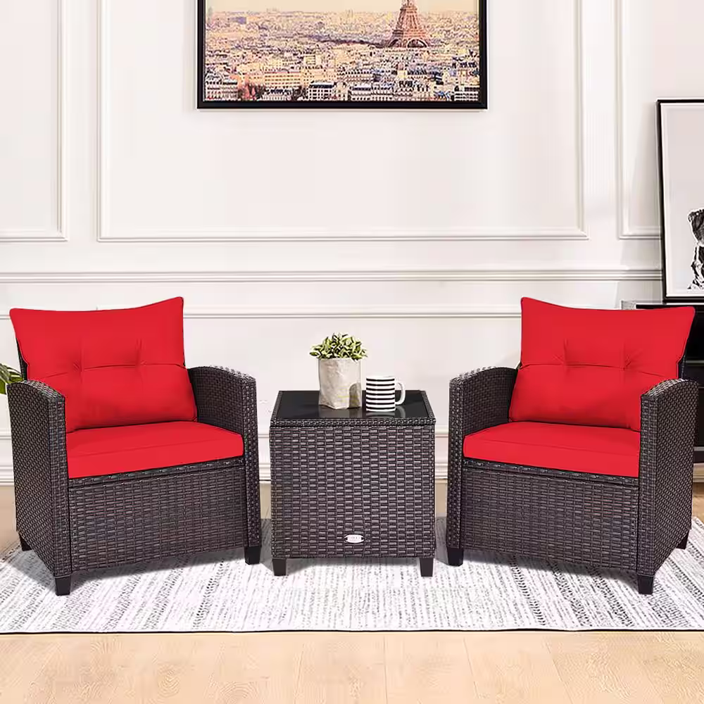 Gymax 3-Pieces Rattan Outdoor Patio Conversation Set with Coffee Table, Red Cushion