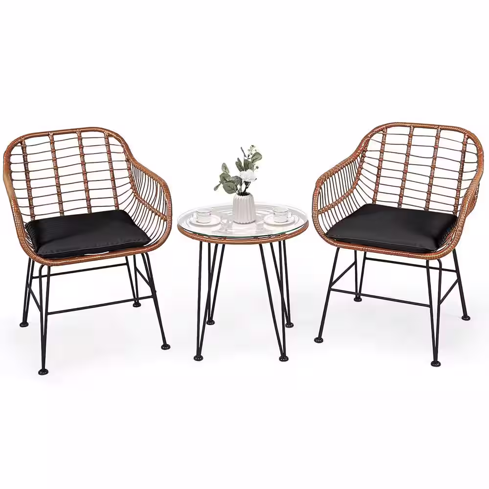 Costway 3-Piece Wicker Patio Rattan Bistro Set Coffee Table Armchair Garden Black Cushion