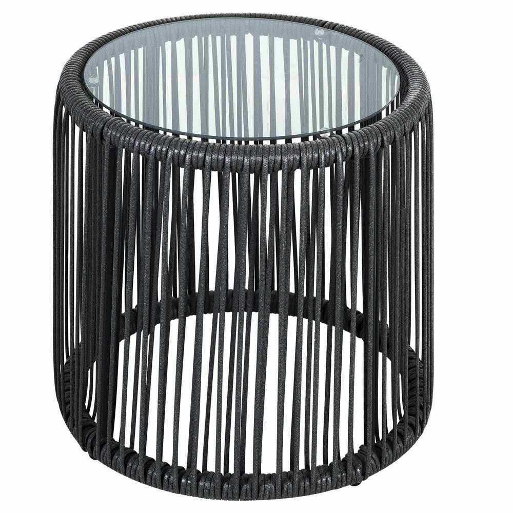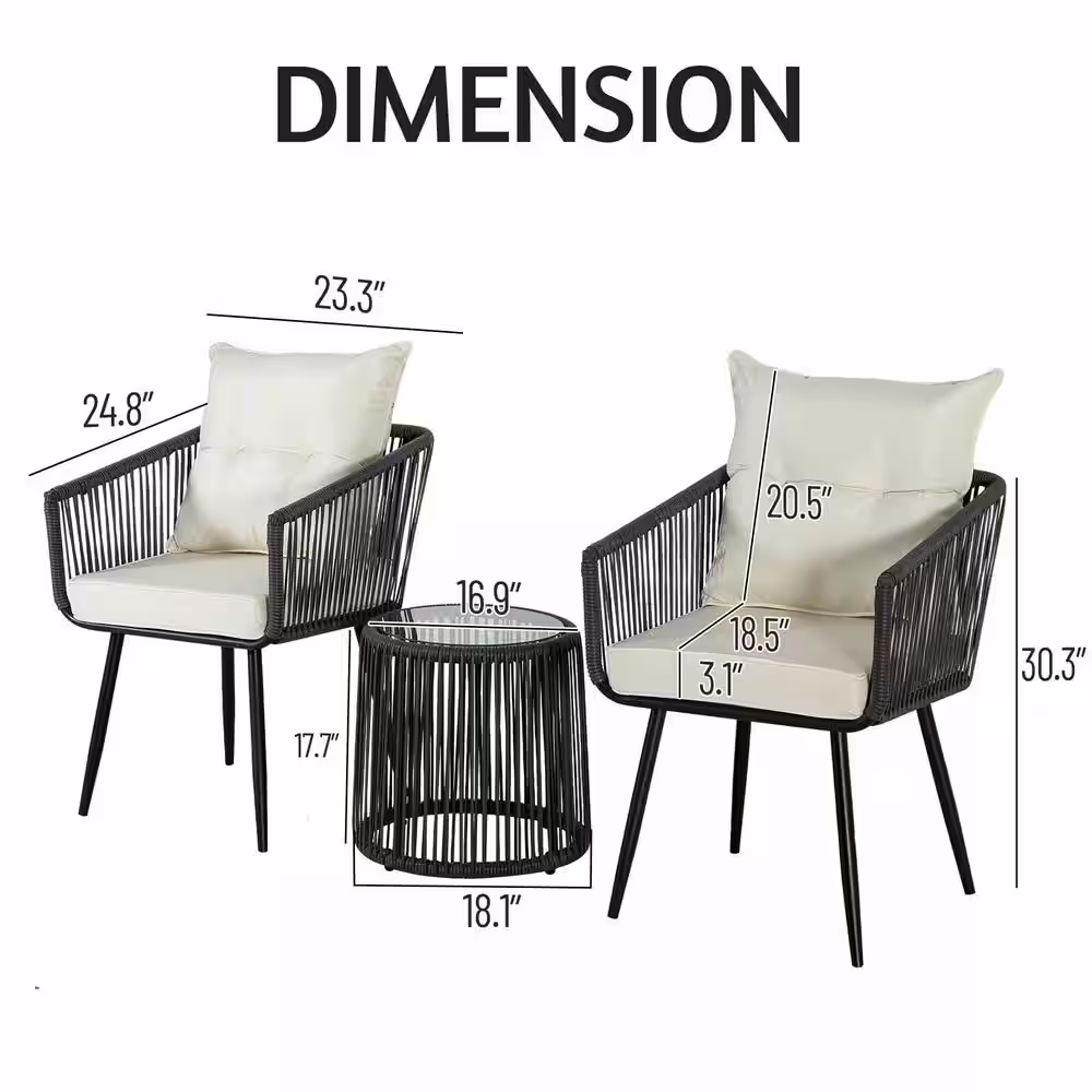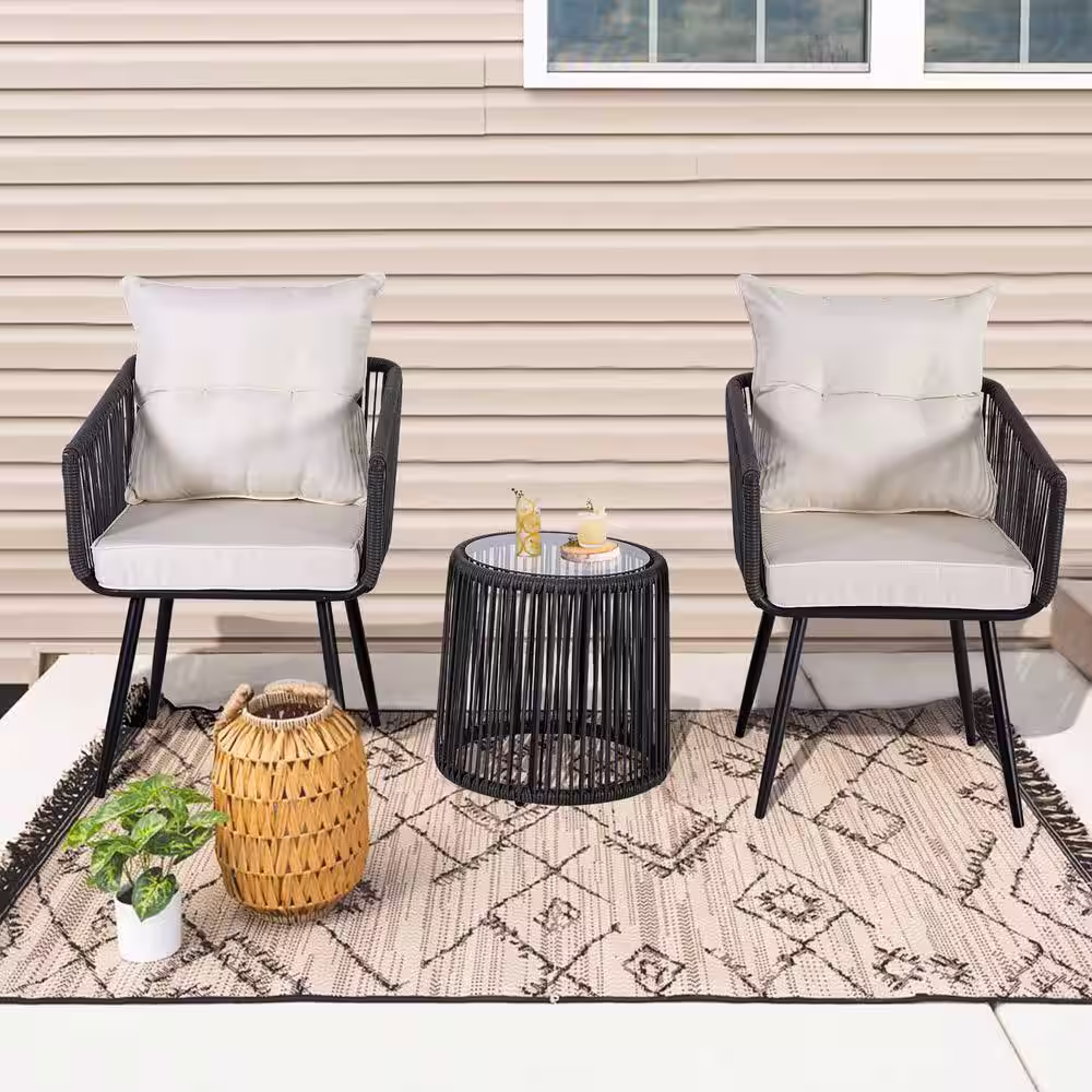 None 3-Piece Outdoor Conversation Set Handwoven Dark Gray Rattan Wicker Chairs with Beige Cushions, Tempered Glass Table