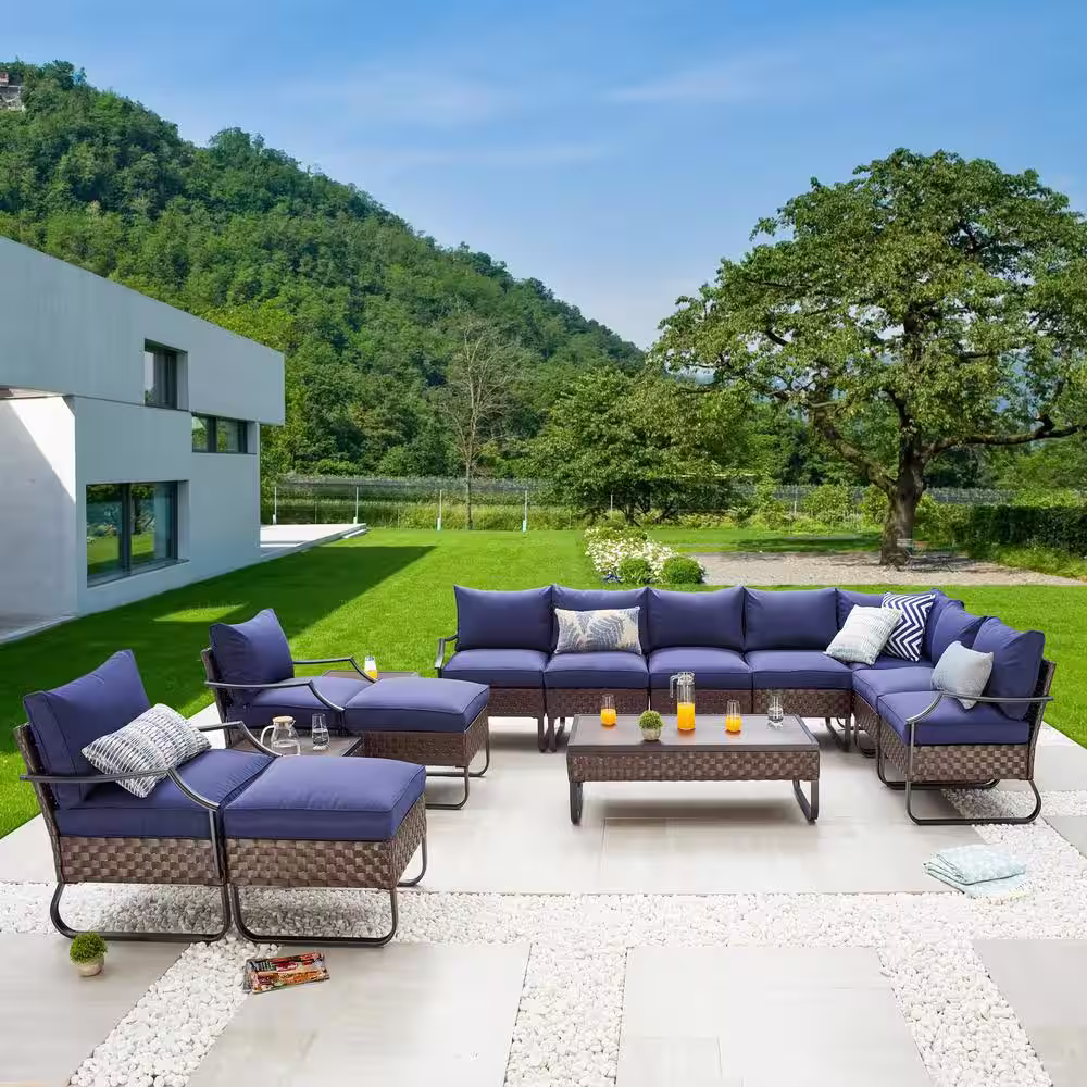 Patio Festival U-Leg 14-Piece Wicker Patio Conversation Set with Blue Cushions