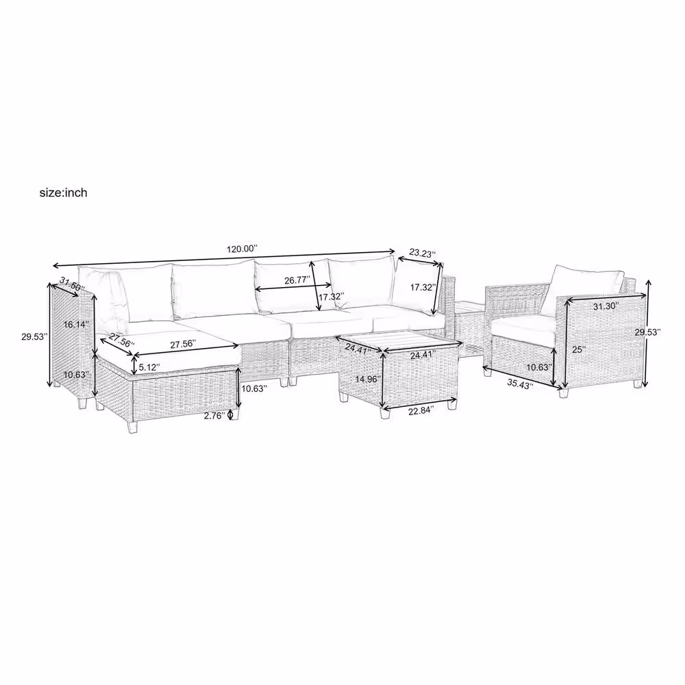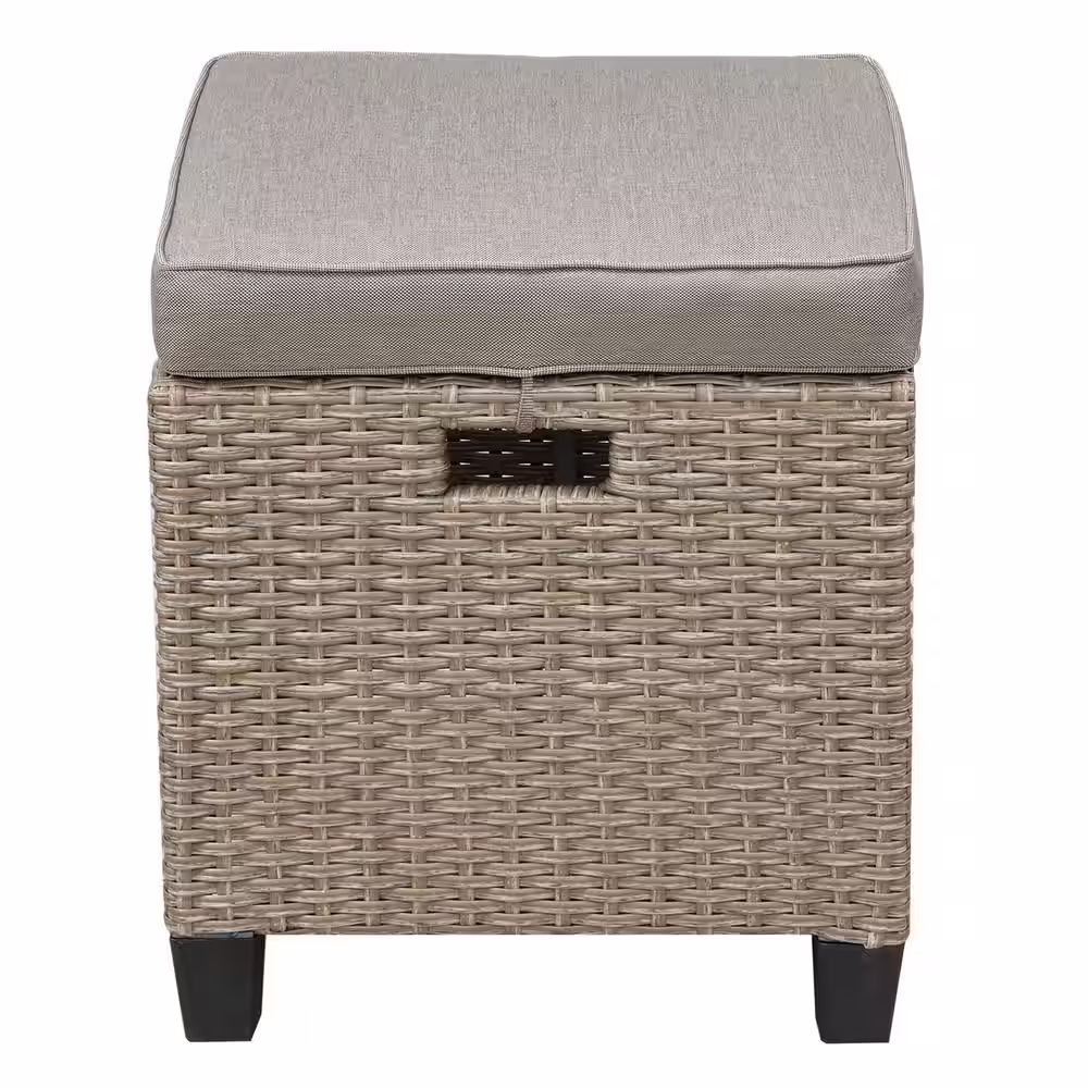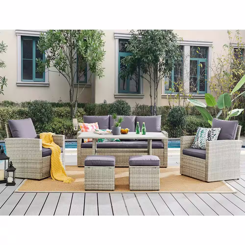 None Gray 6-Piece Wicker Patio Conversation Set with White Cushion and Ottoman