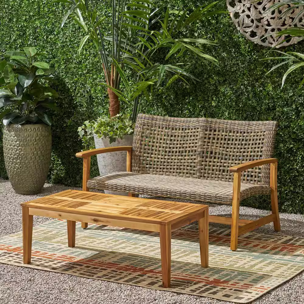 Noble House Hampton Natural 2-Piece Wood and Faux Rattan Patio Conversation Set