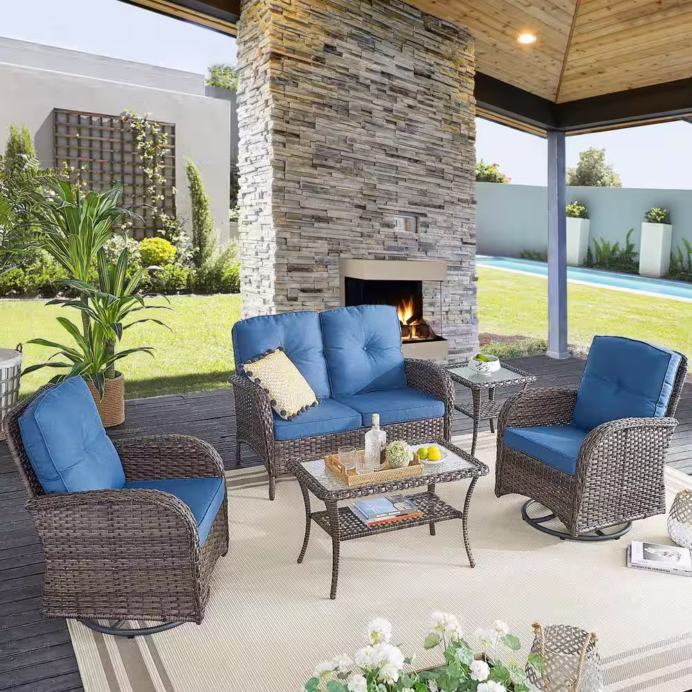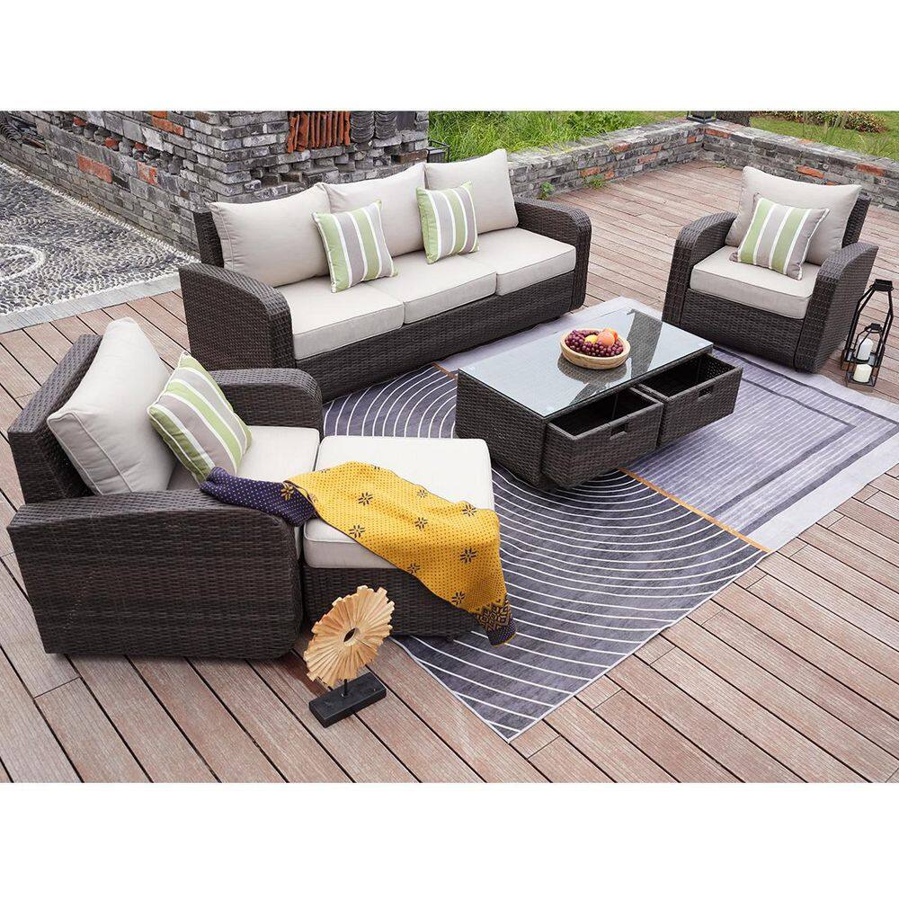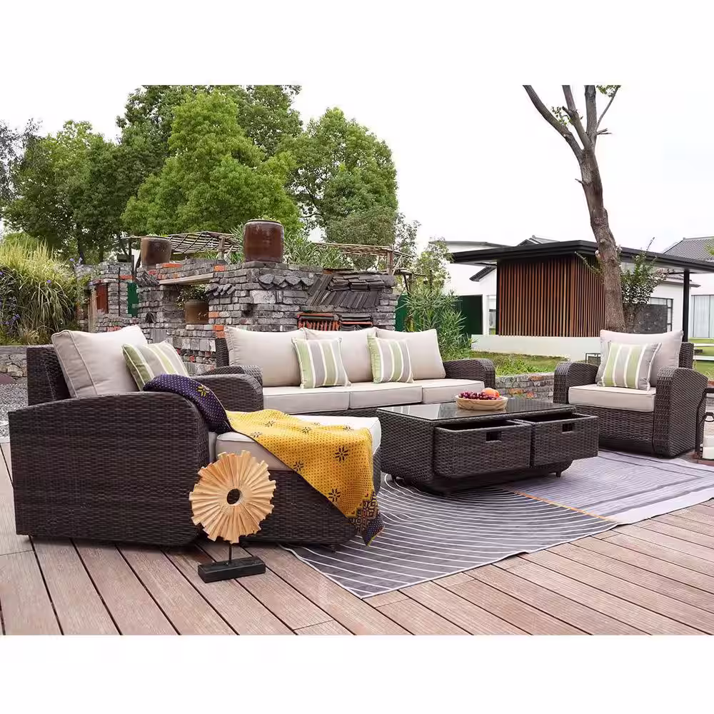moda furnishings Archer Brown 5-Piece Wicker Patio Conversation Set with Beige Cushions
