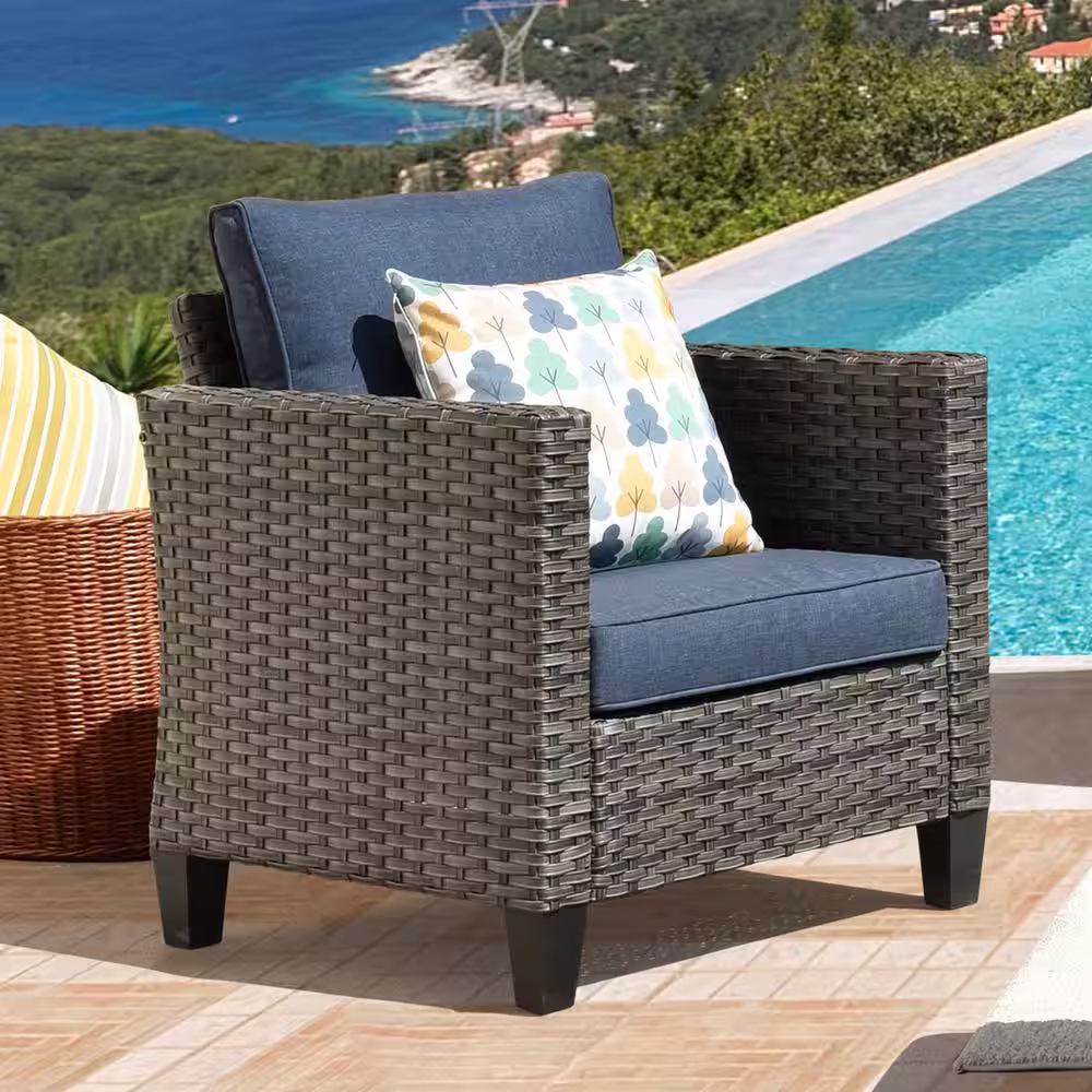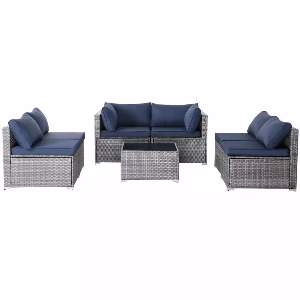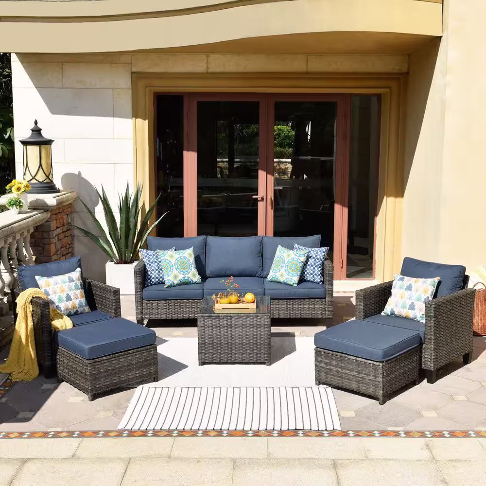 XIZZI Mars Gray 6-Piece Wicker Outdoor Patio Conversation Seating Set with Denim Blue Cushions