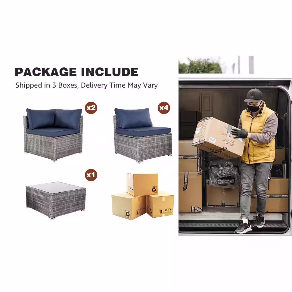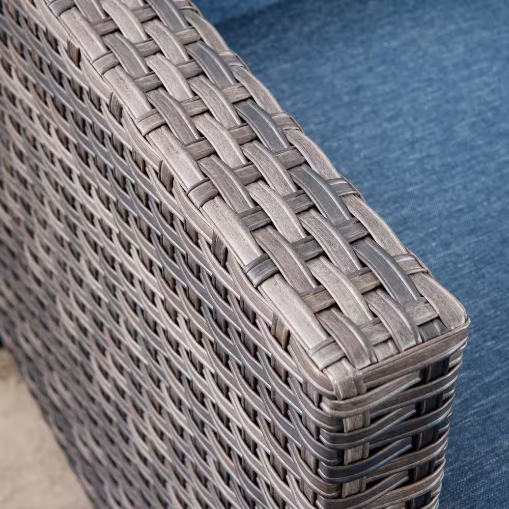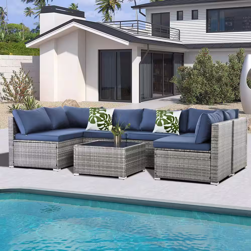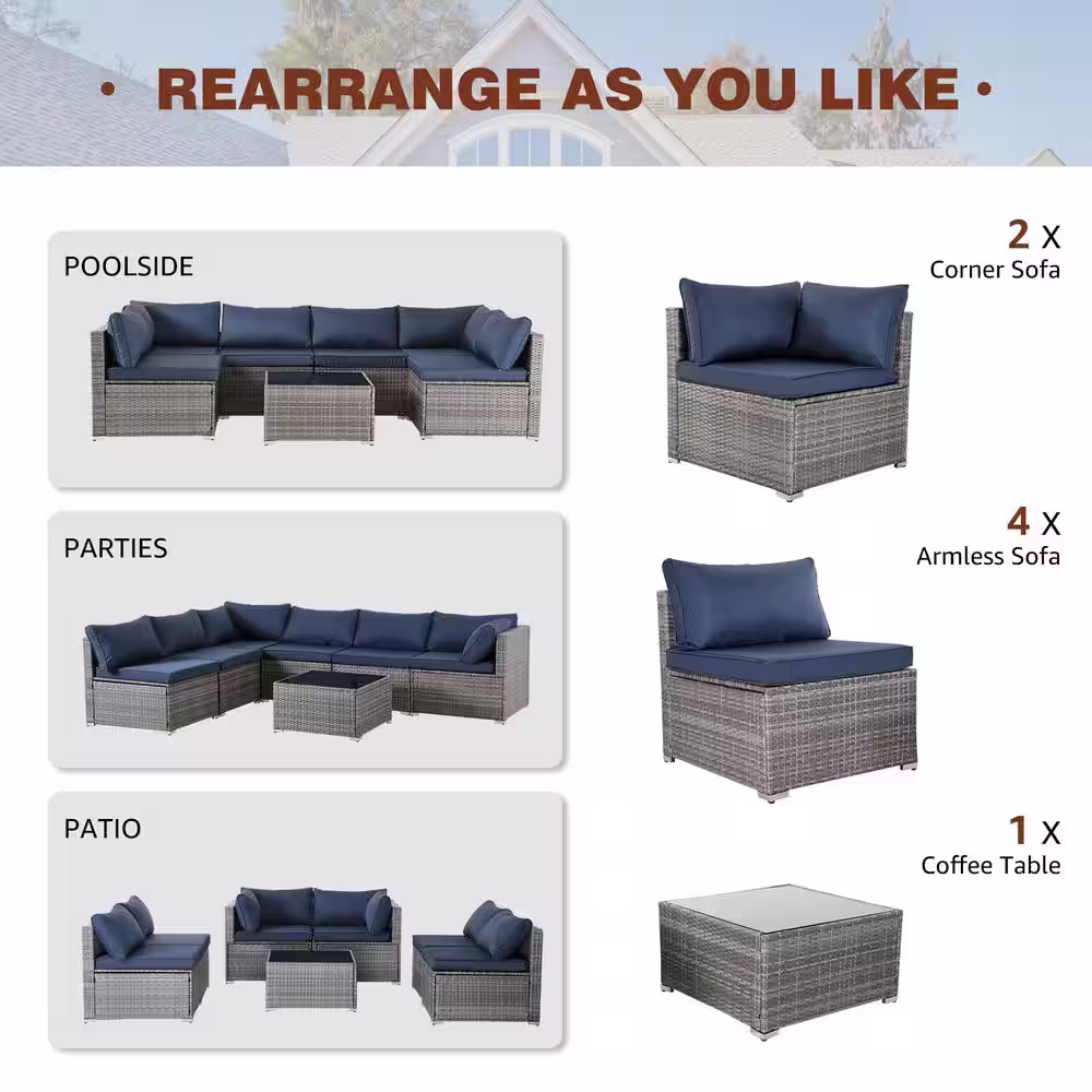 None All-Weather 7-Piece Gray PE Wicker Patio Conversation Set with Navy Blue Cushions