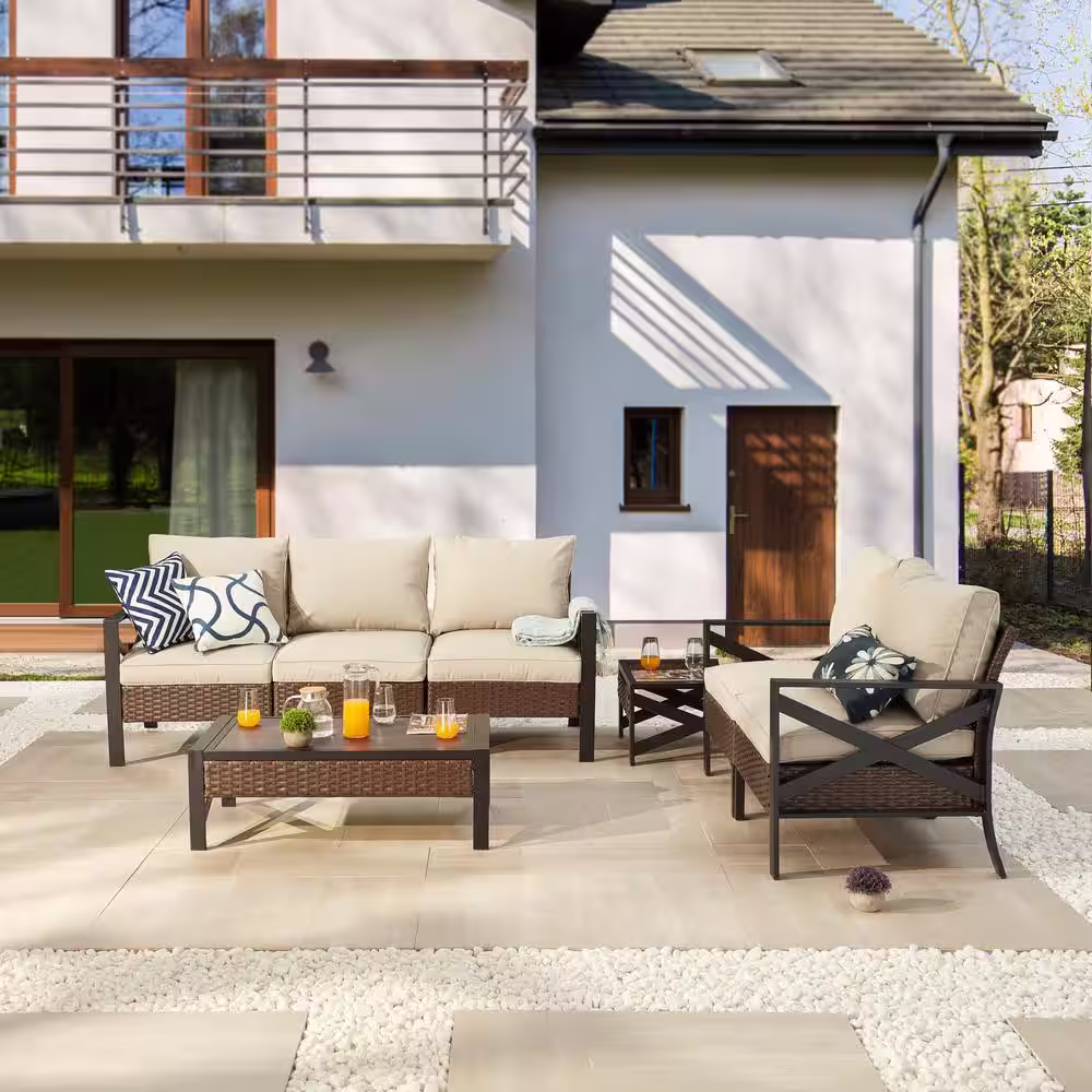 Patio Festival 6-Piece Wicker Patio Conversation Seating Set with Beige Cushions