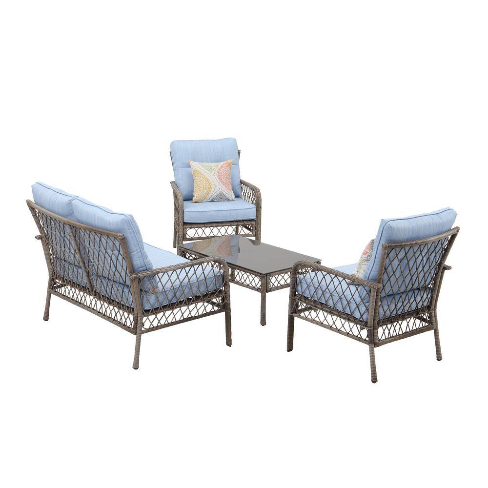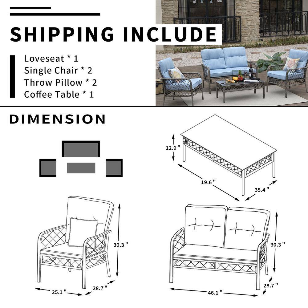 None 4-Piece Metal Outdoor Hollow-Out Patio Conversation Set Seating Group with Blue Cushions