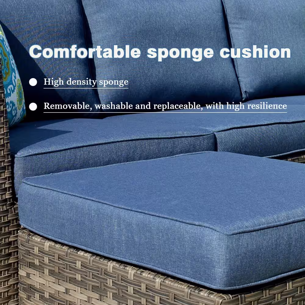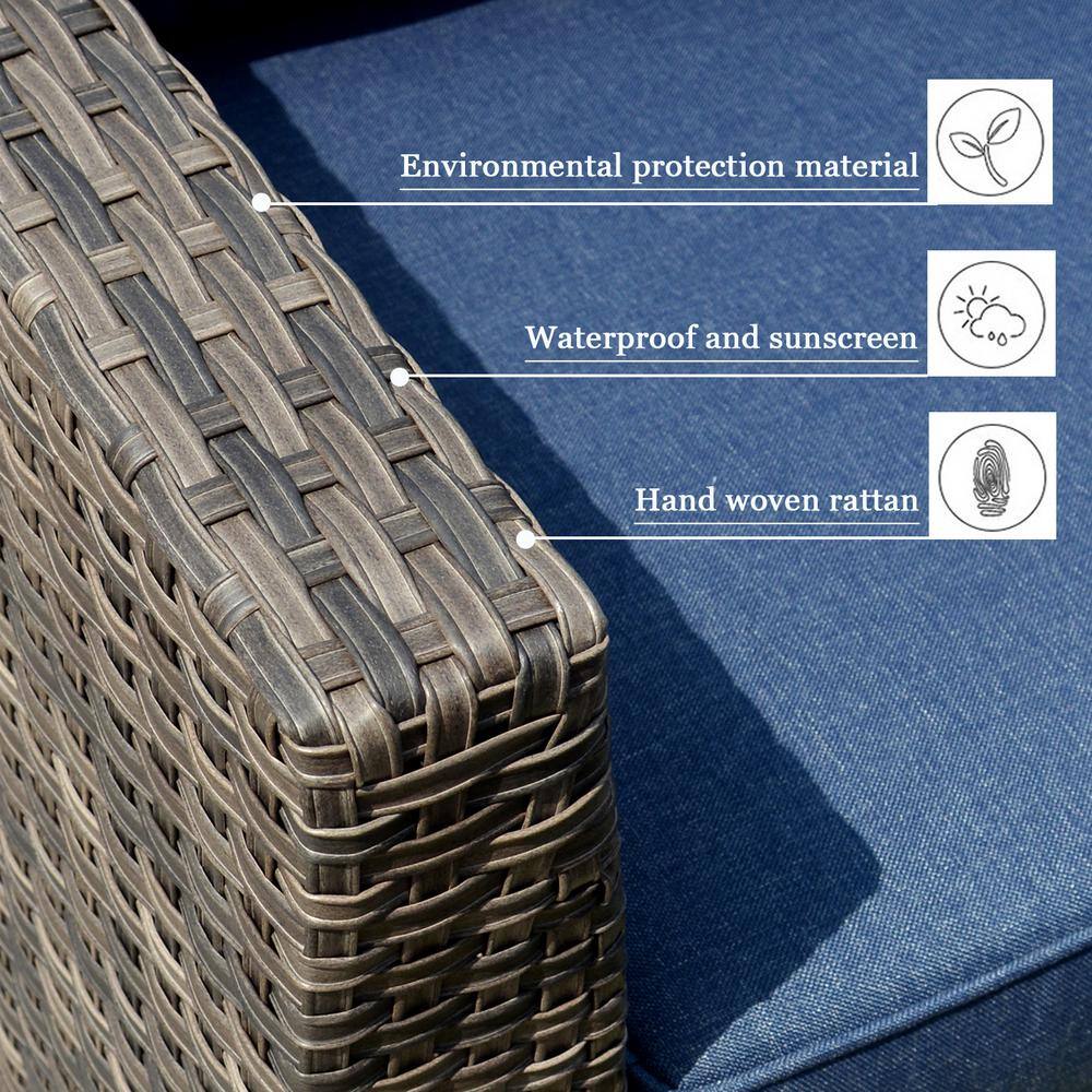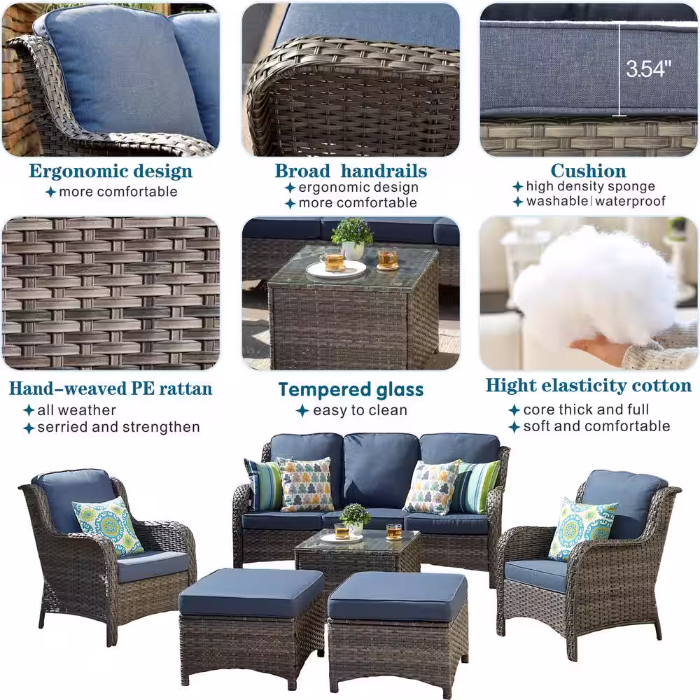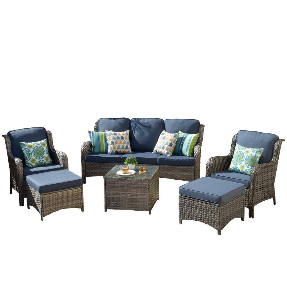 OVIOS Joyoung Gray 6-Piece Wicker Outdoor Patio Conversation Seating Set with Denim Blue Cushions