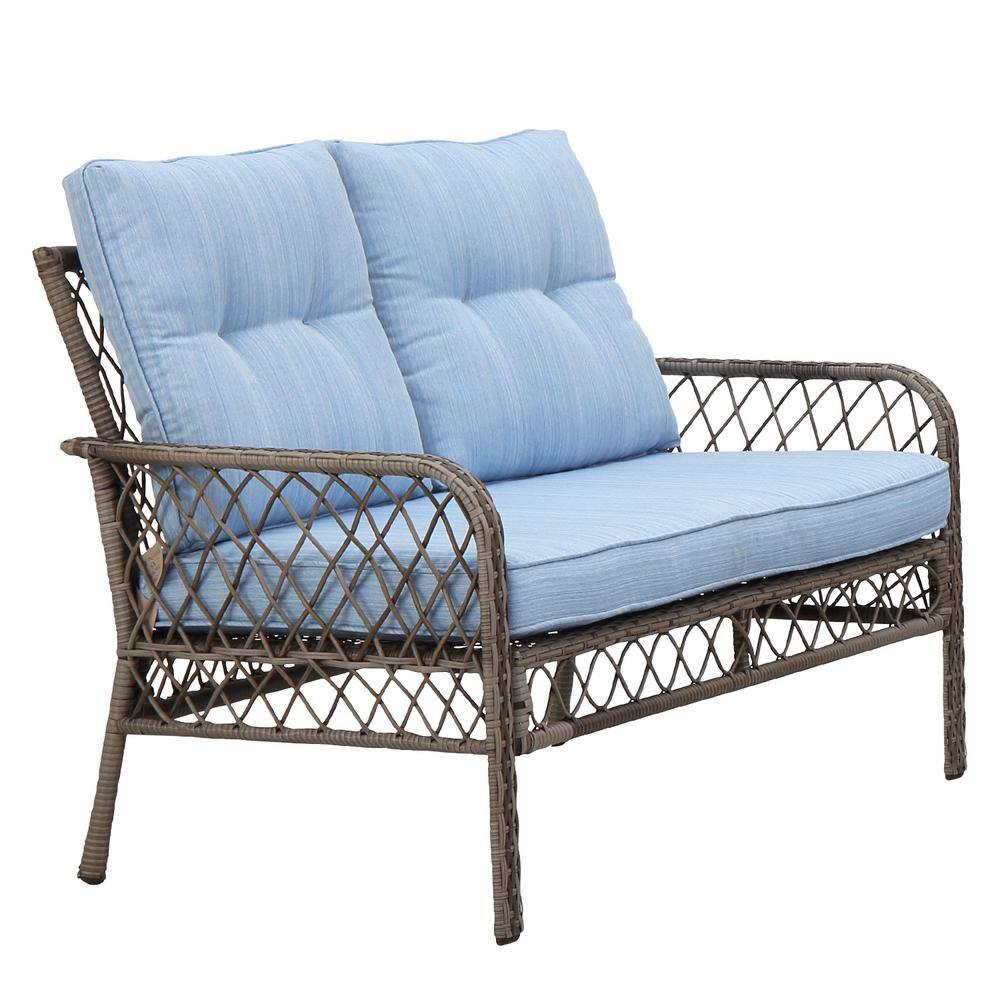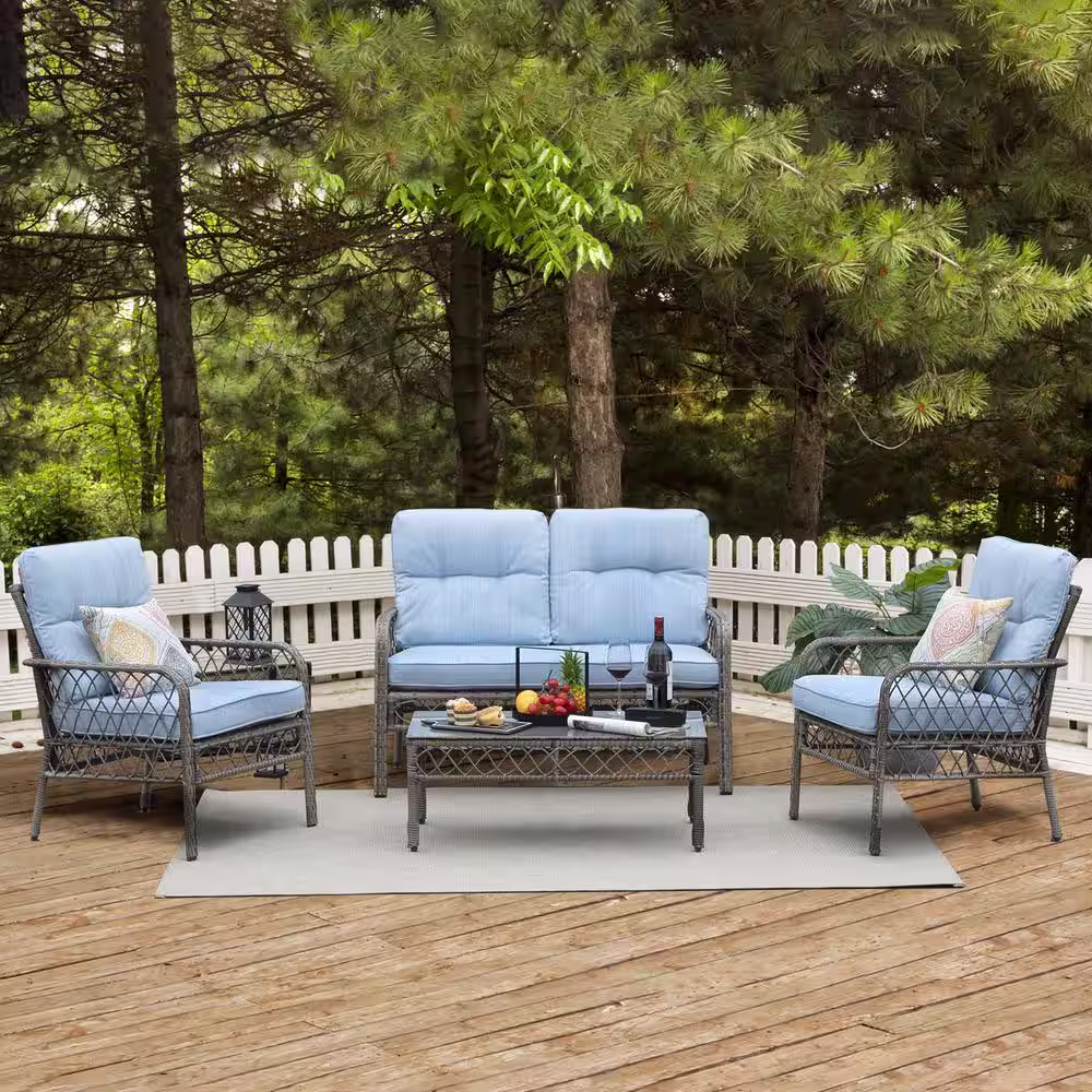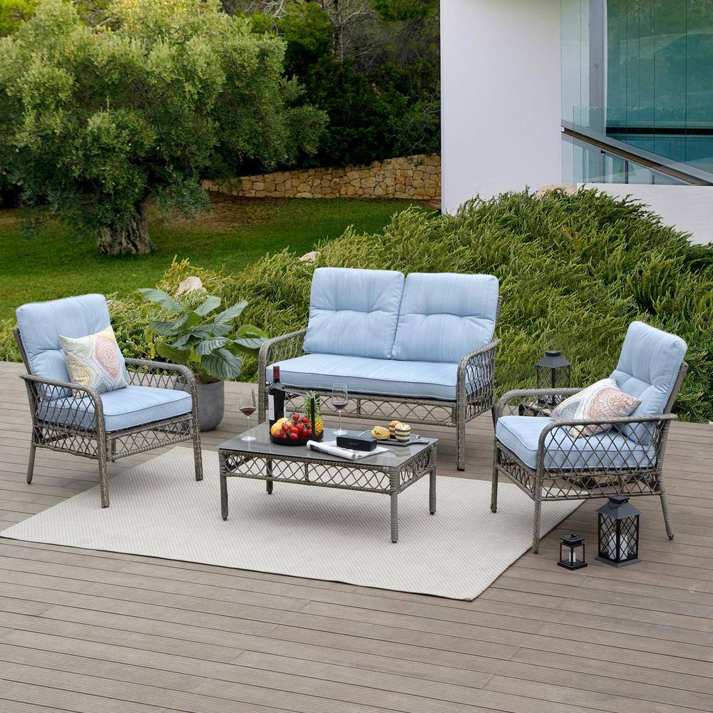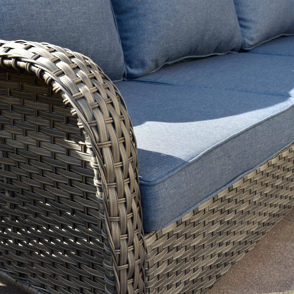 OVIOS Joyoung Gray 6-Piece Wicker Outdoor Patio Conversation Seating Set with Denim Blue Cushions