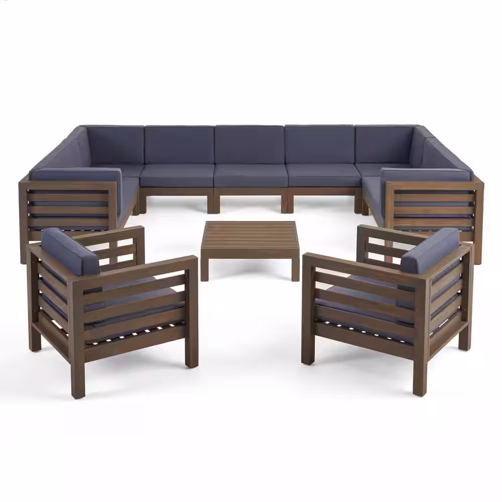 Noble House Oana Grey 10-Piece Wood Patio Conversation Sectional Seating Set with Dark Grey Cushions