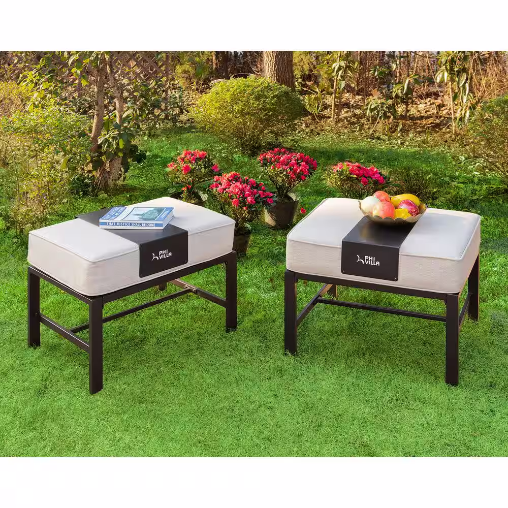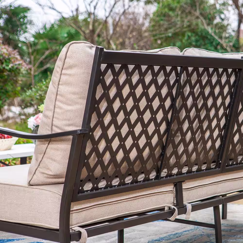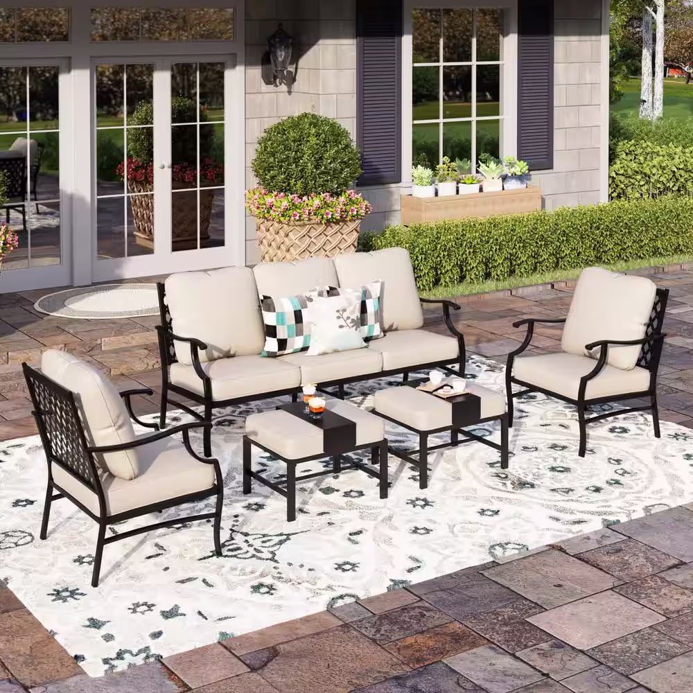 None Black 5-Piece Metal Meshed 7-Seat Outdoor Patio Conversation Set with Beige Cushions and 2 Ottomans