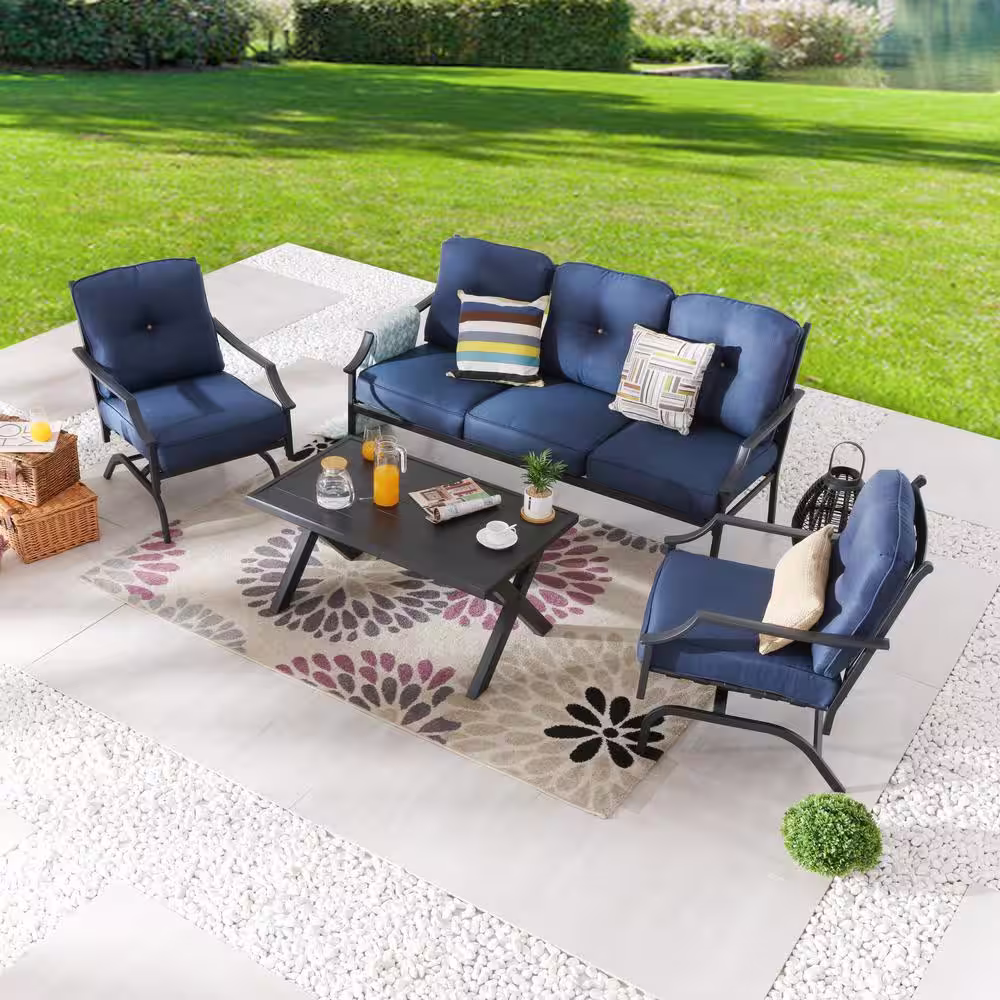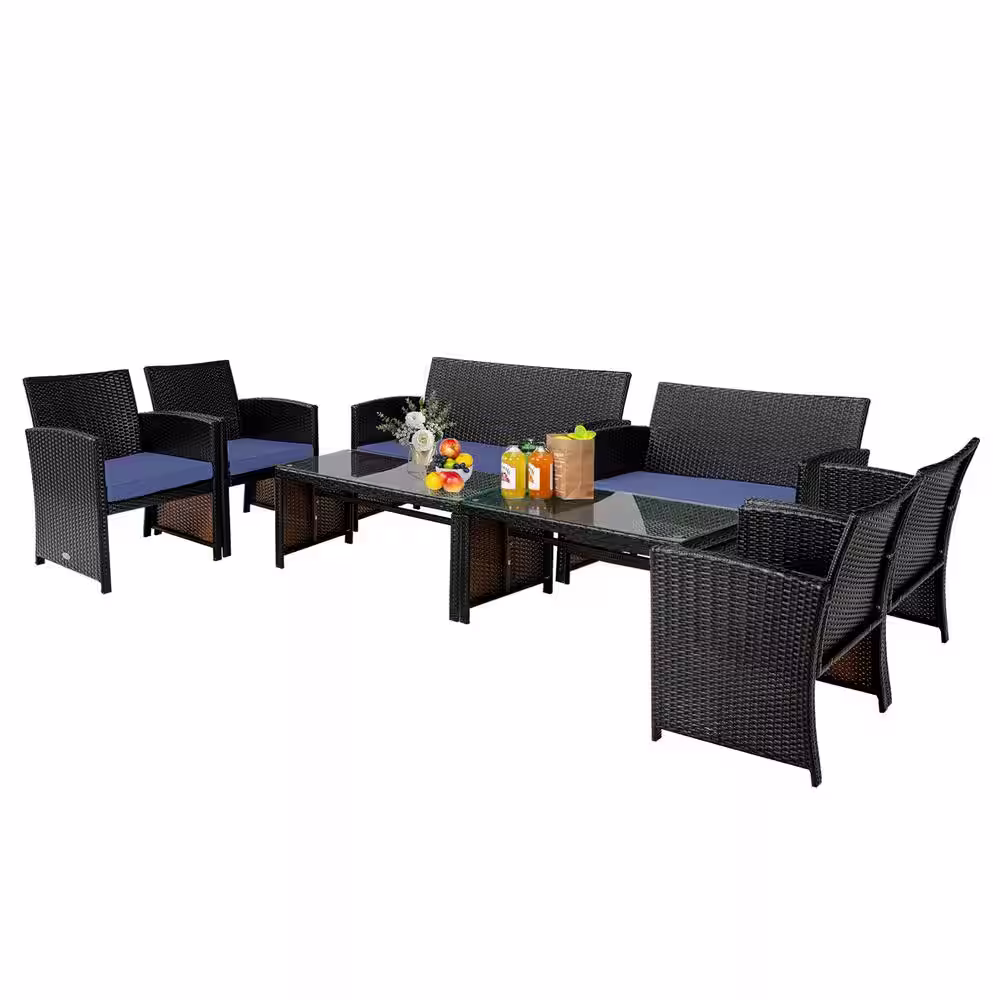 Costway Brown 4-Piece Rattan Furniture Set Patio Conversation Set with Navy Cushions