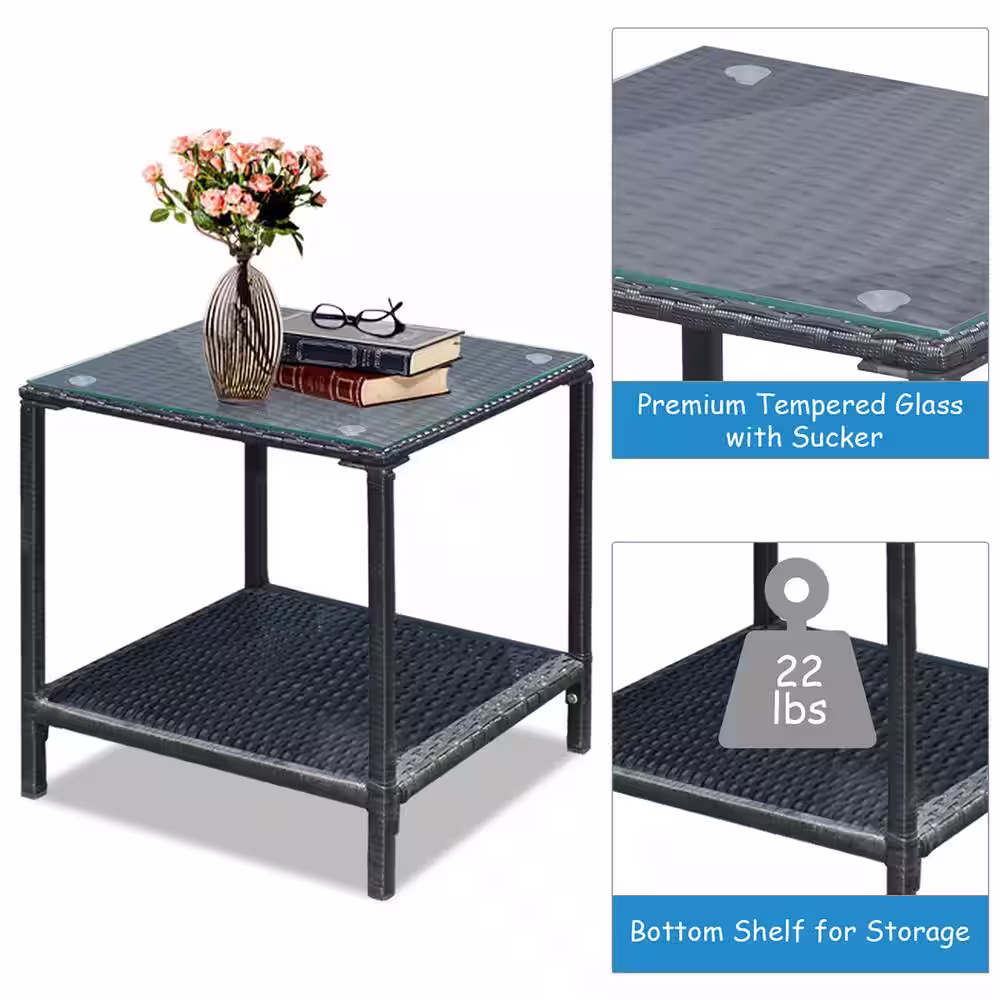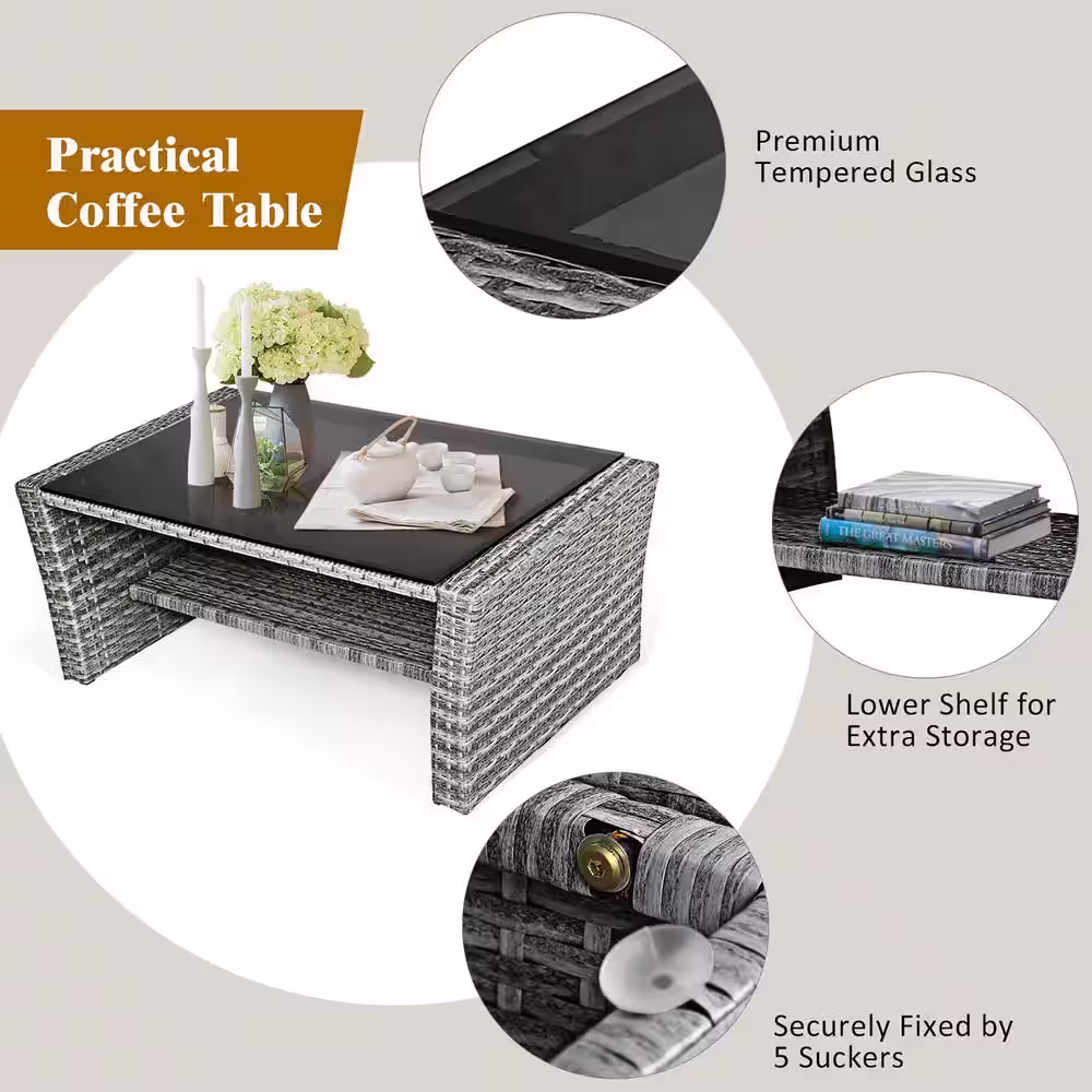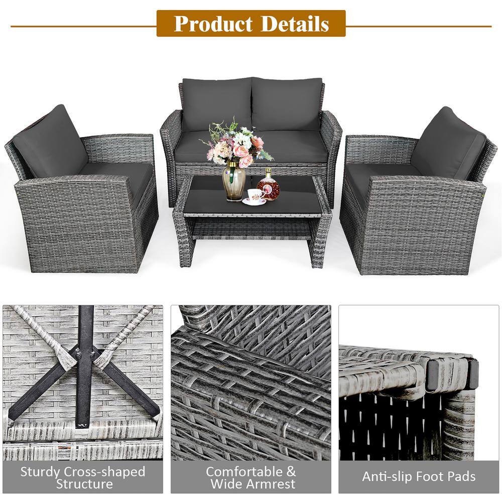 Costway 4-Pieces Wicker Patio Conversation Set Sofa Table with Storage Shelf and Gray Cushion