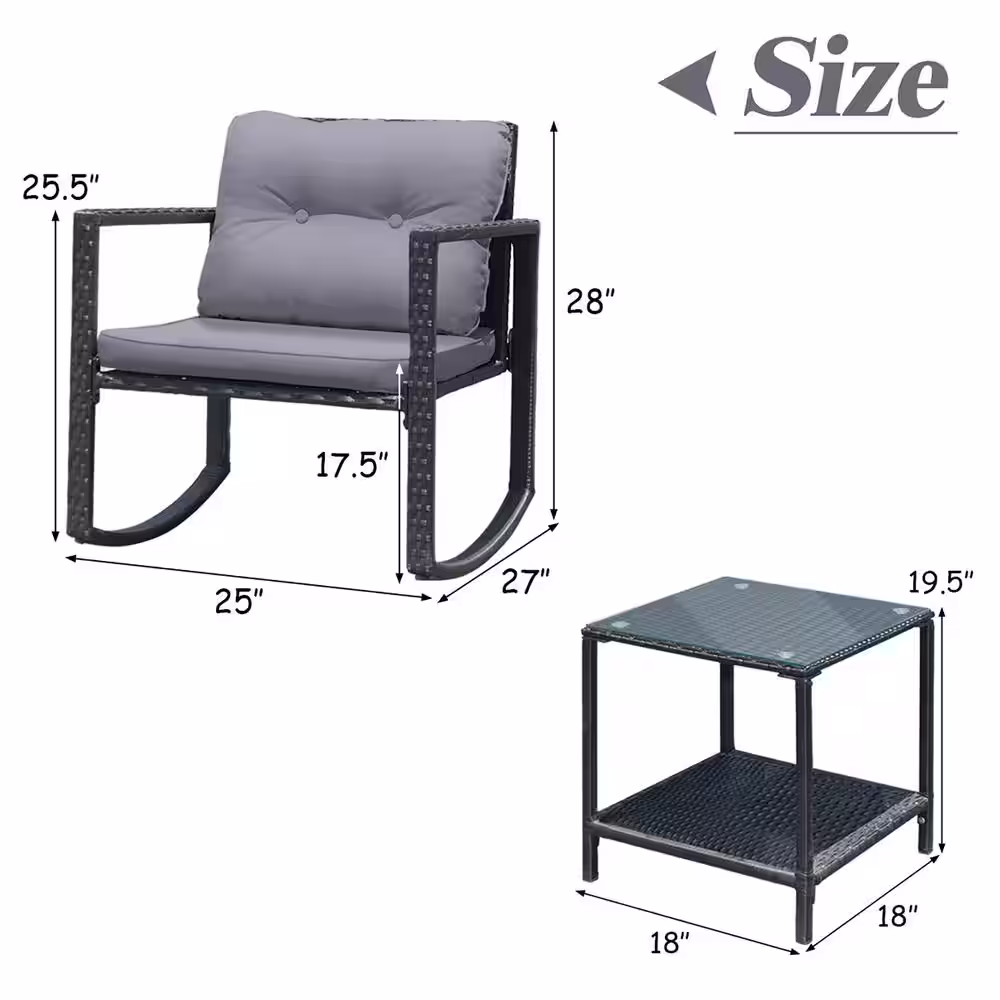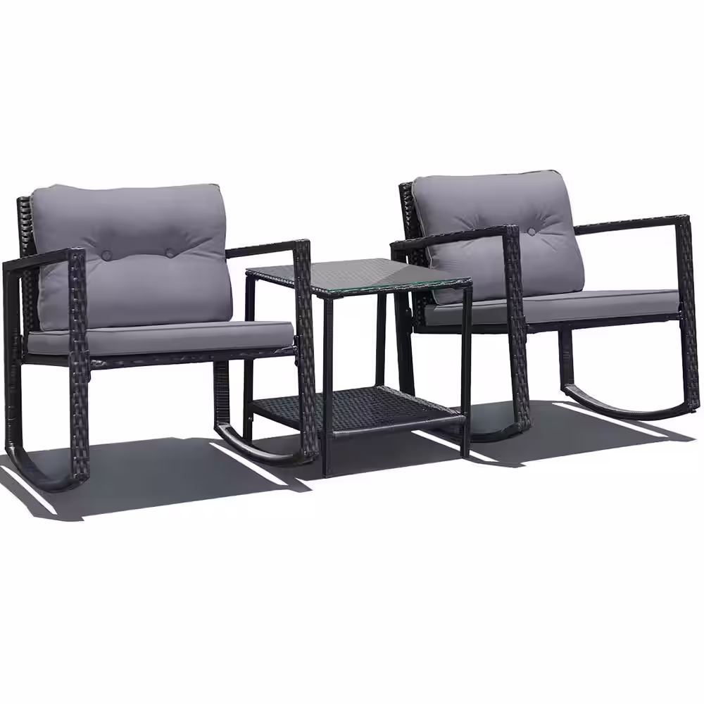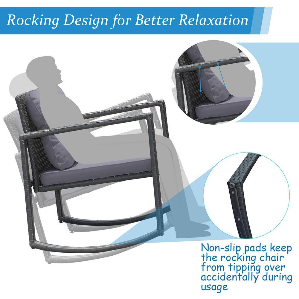 Costway 3-Piece Wicker Patio Furniture Set Rocking Chairs Gray Cushioned Sofa