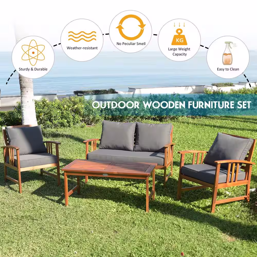 Noble House Sebastian Teak Brown 4-Piece Wood Patio Conversation Sectional Seating Set with Beige Cushions