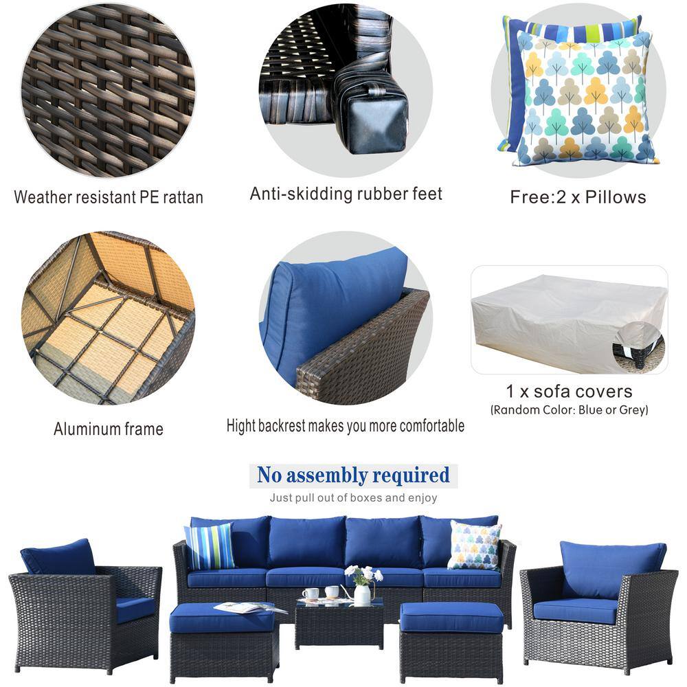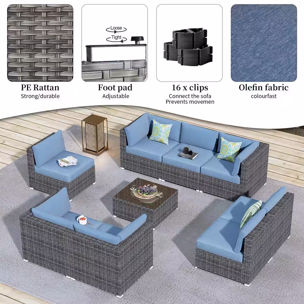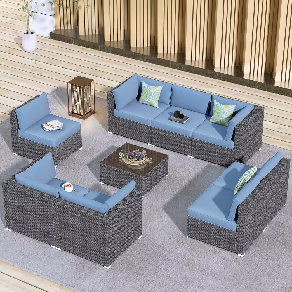 HOOOWOOO Messi Grey 9-Piece Wicker Outdoor Patio Conversation Sofa Seating Set with Denim Blue Cushions