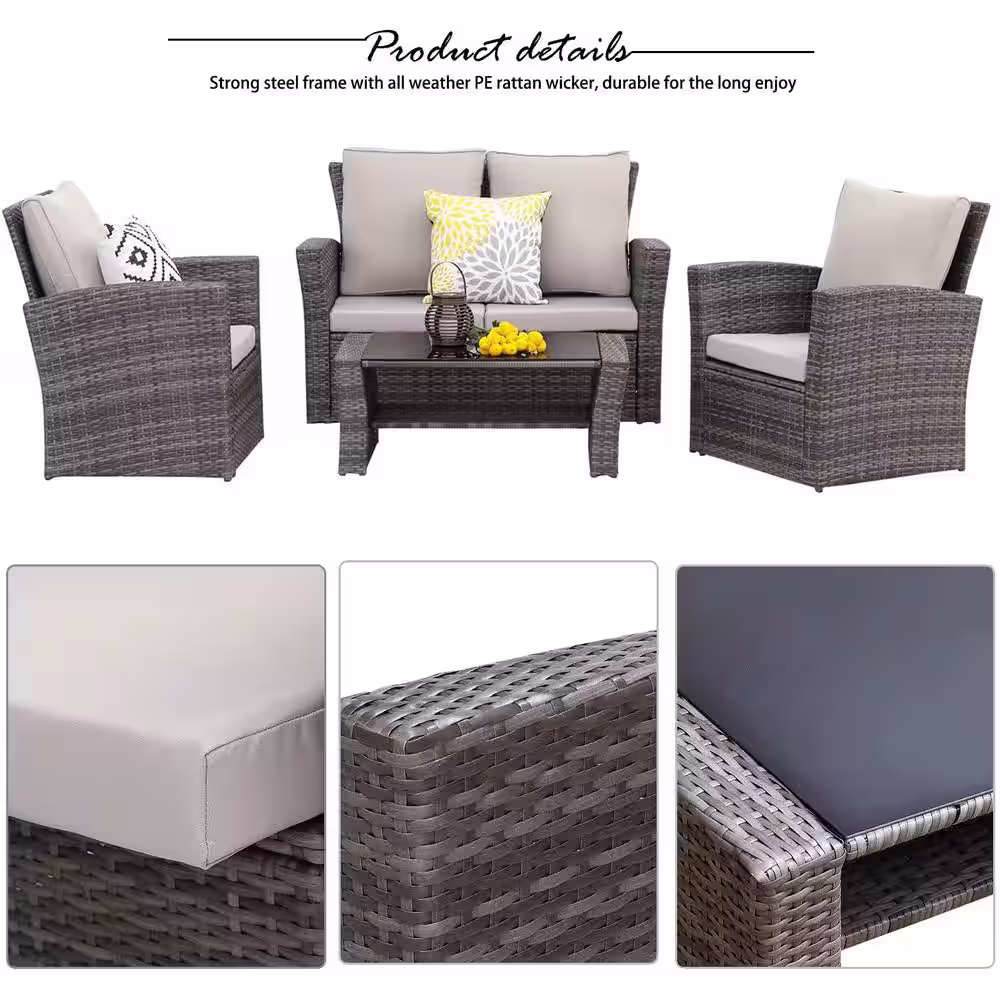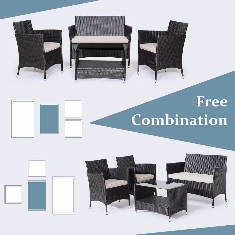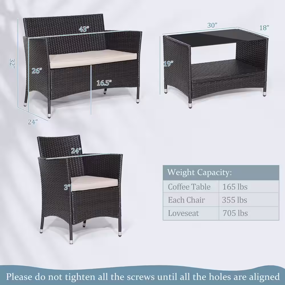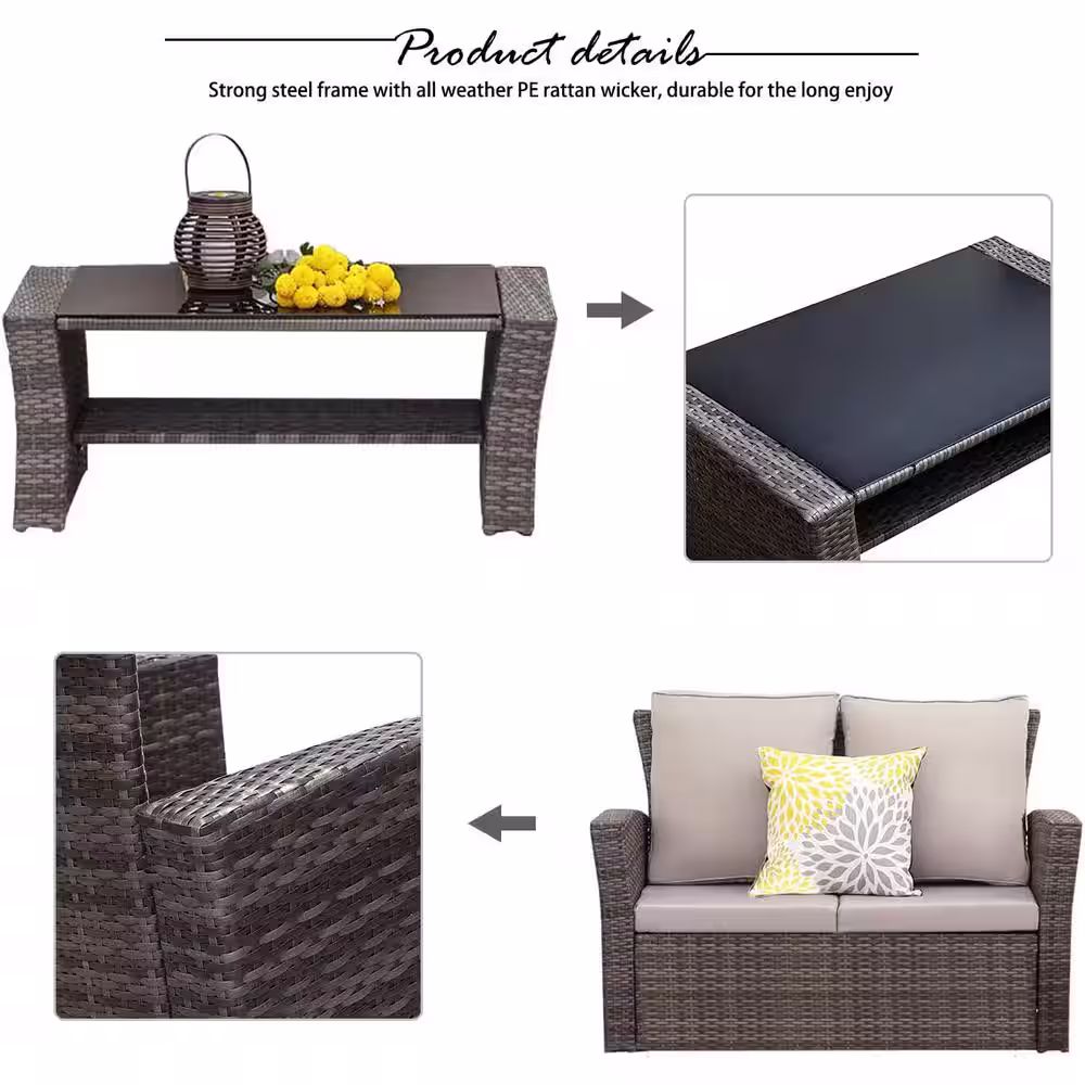 Costway 4-pieces Wicker Patio Conversation Set Armrest Sofa Coffee Table with Beige Cushions Shelf Garden