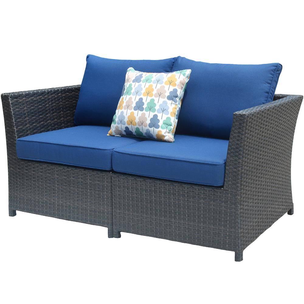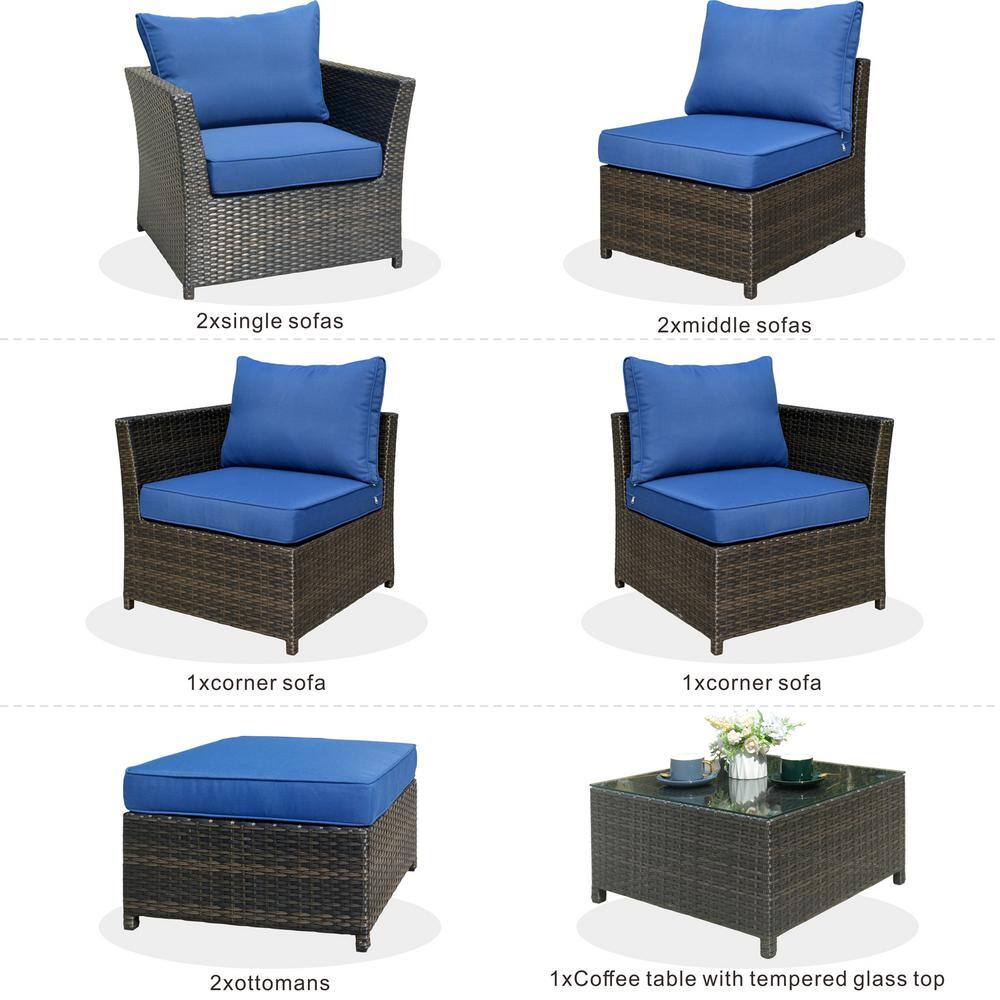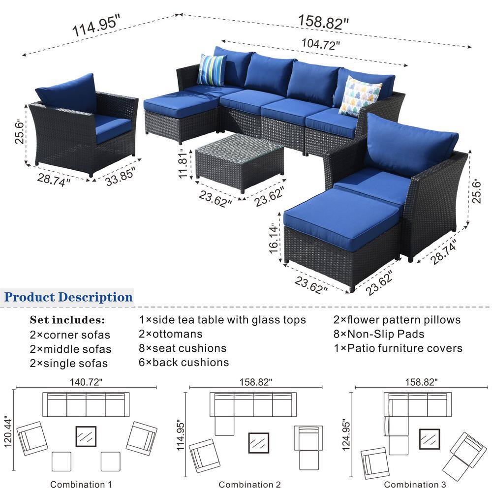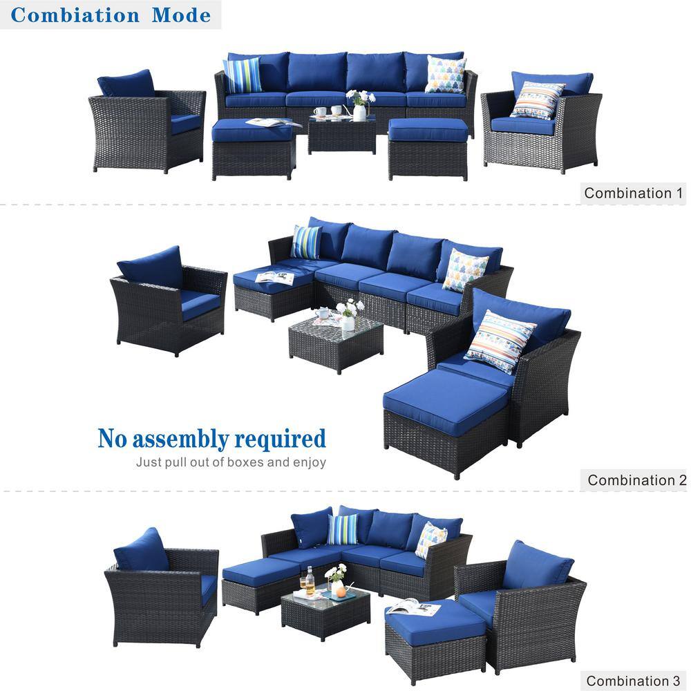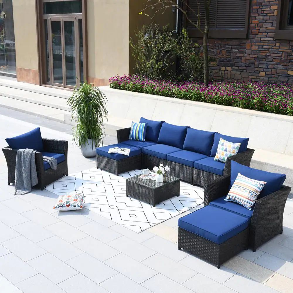 XIZZI Huron Gorden Brown 9-Piece Wicker Outdoor Patio Conversation Sectional Sofa Set with Navy Blue Cushions