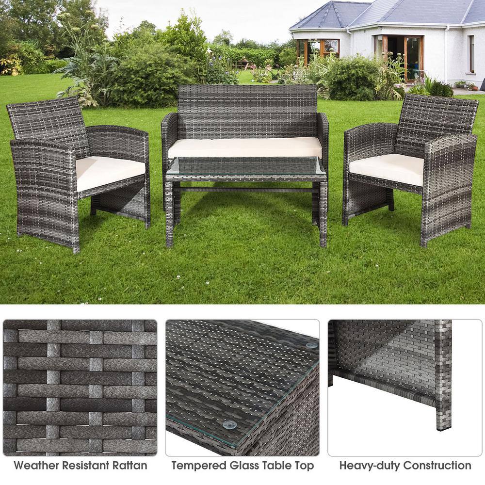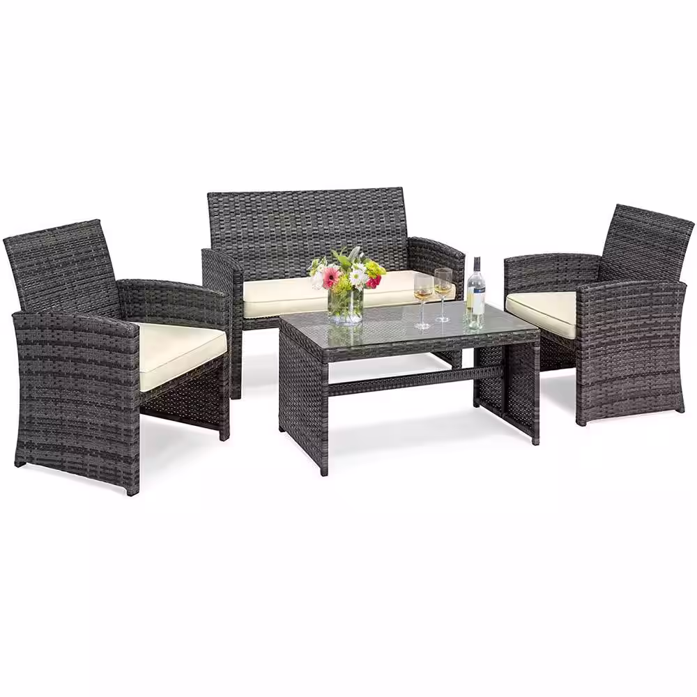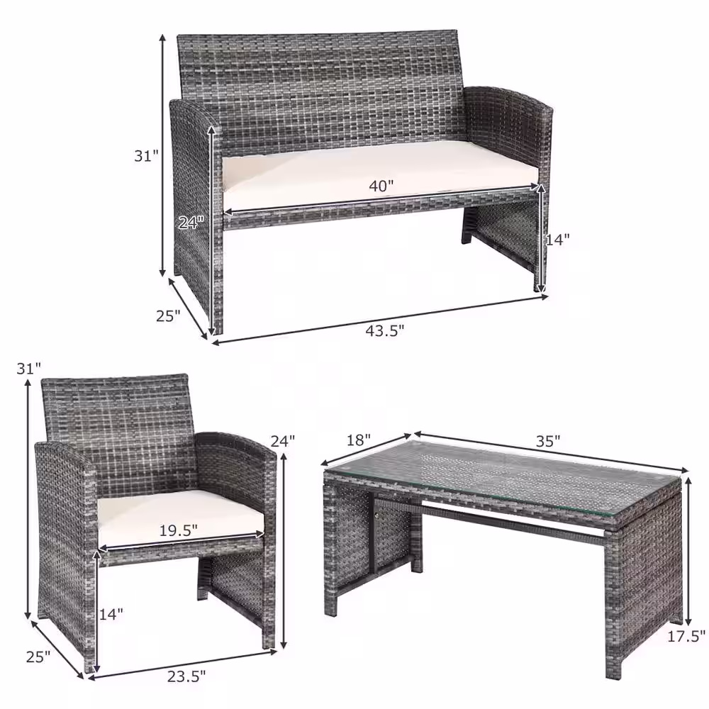 Costway 4-Piece Patio Rattan Conversation Set Outdoor Wicker Furniture Set with Tempered Glass in Beige/Tan Cushion