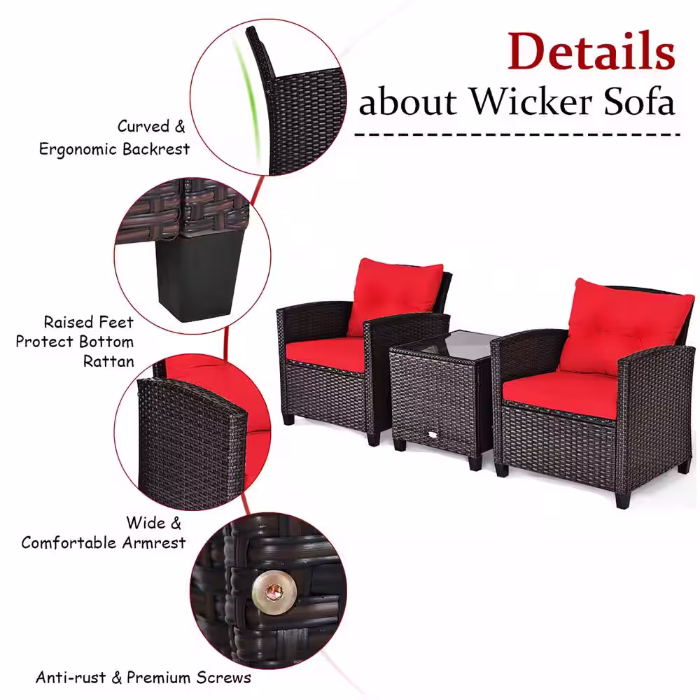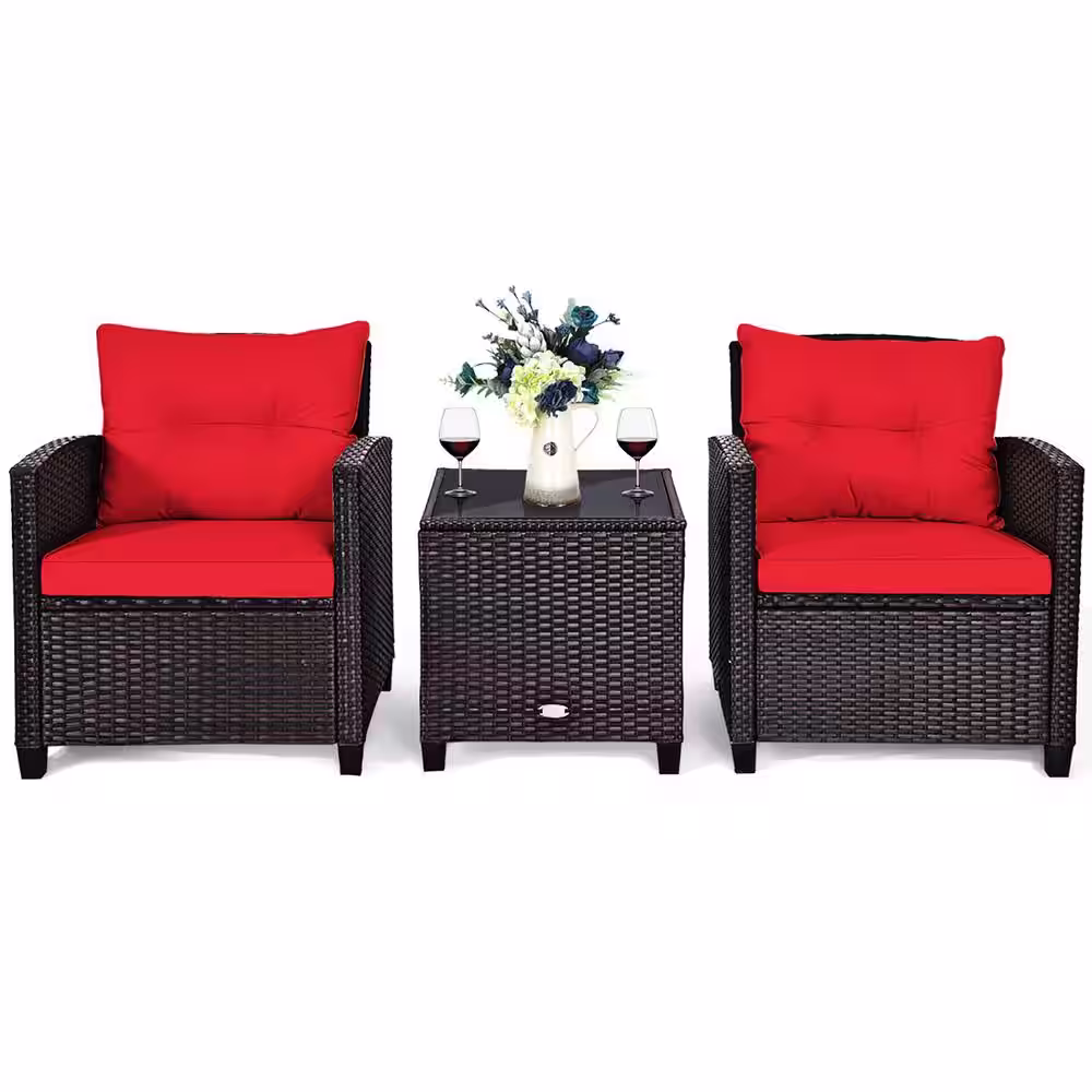 Costway Mix Brown 3-Piece Rattan Wicker Patio Conversation Set Sofa Coffee Table with Red Cushions