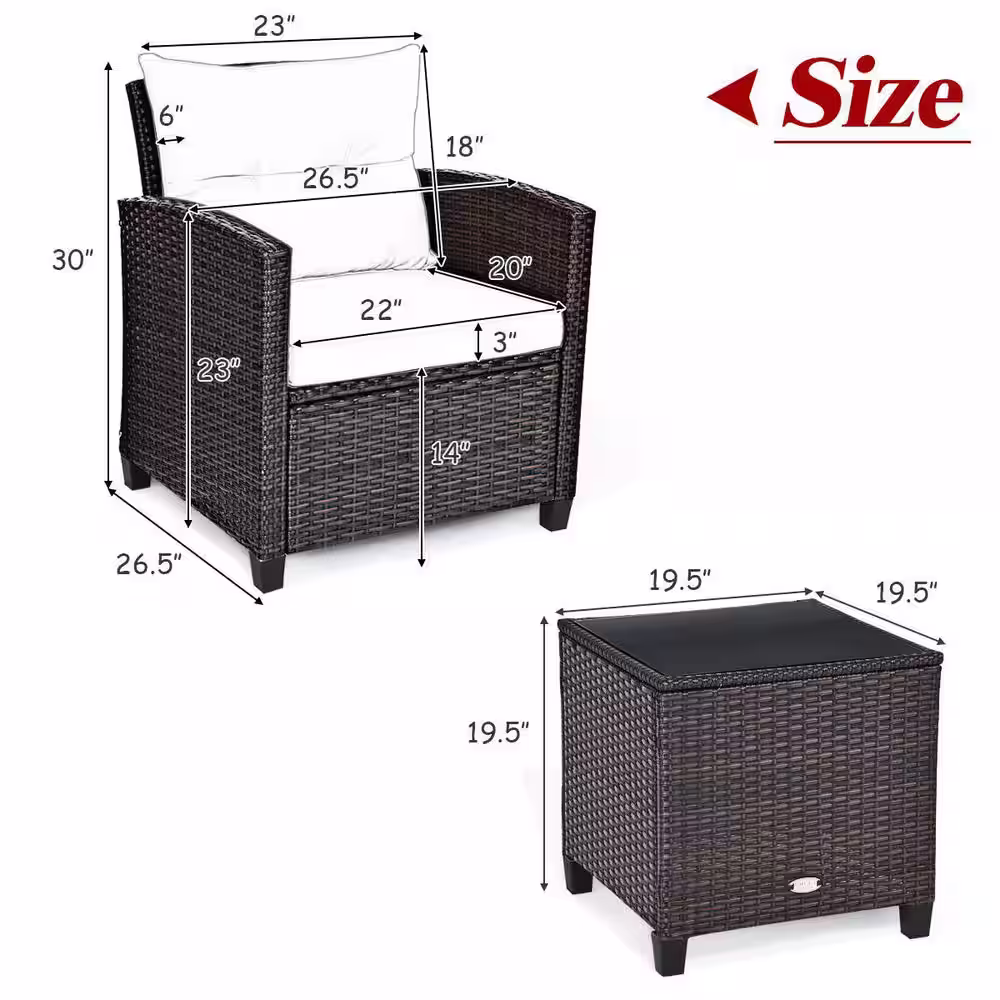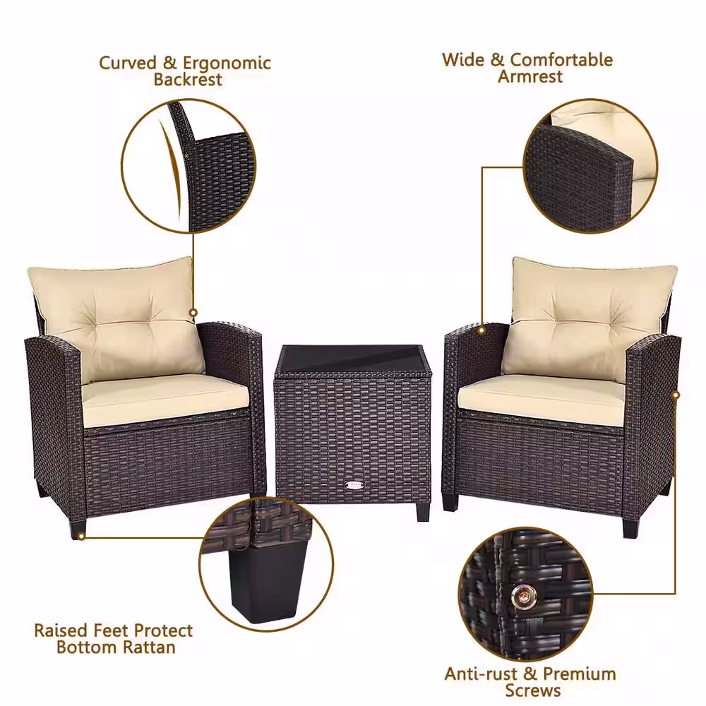 HONEY JOY Brown 3-Pieces Wicker Patio Conversation Set Outdoor Rattan Furniture with Beige Cushions