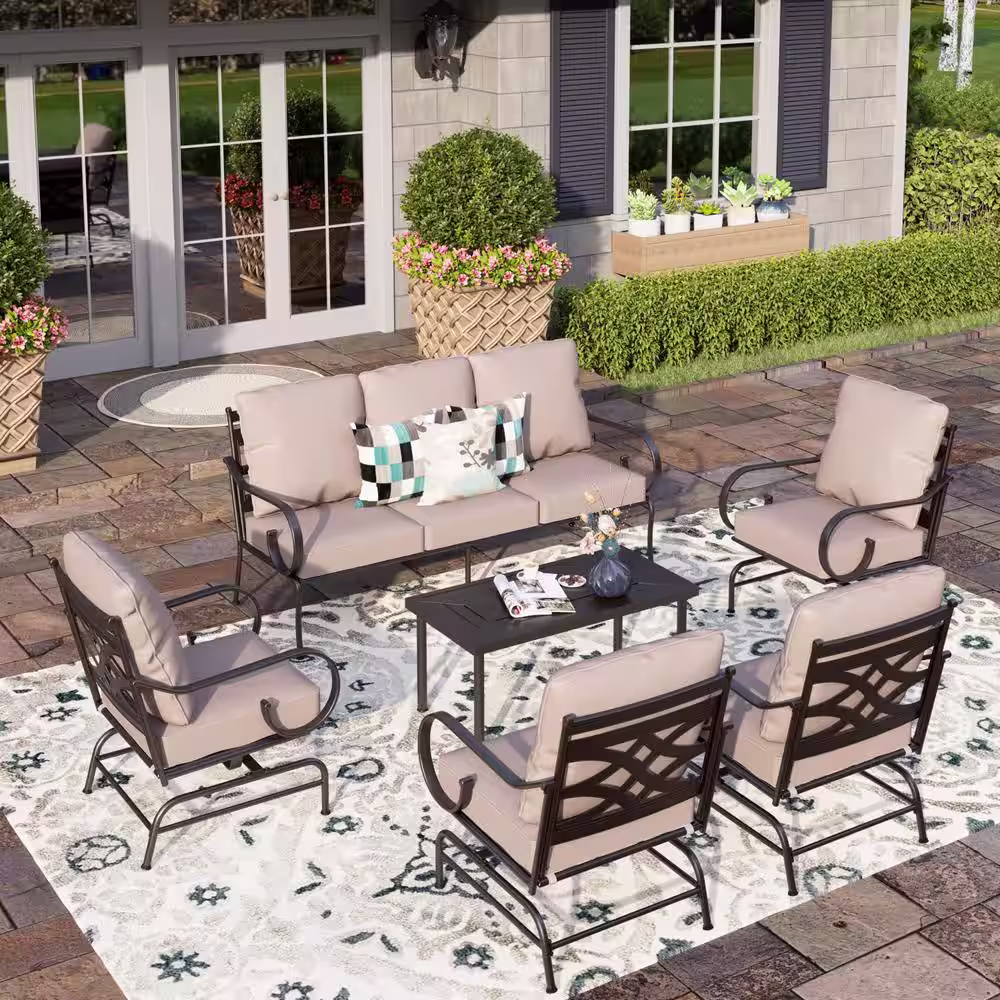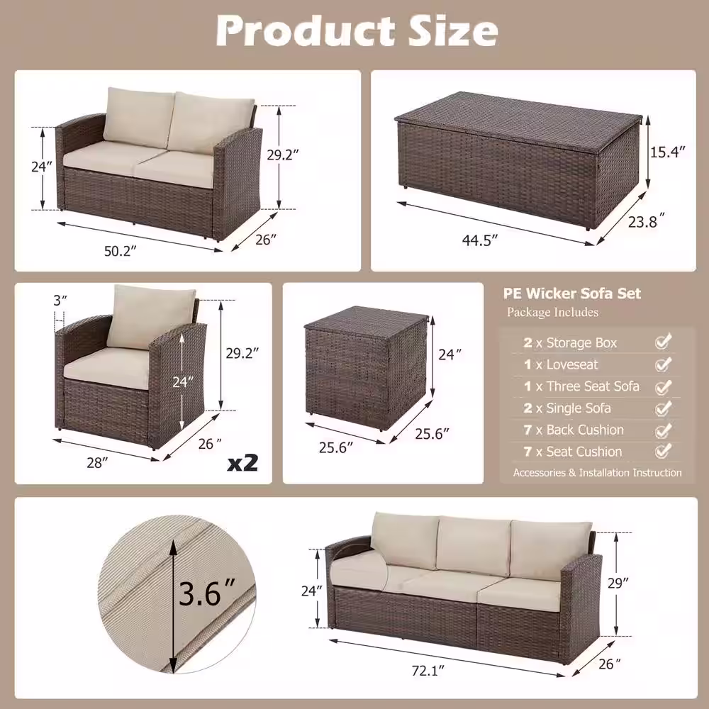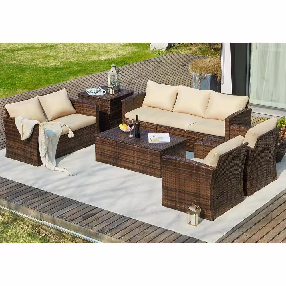 AECOJOY Brown 6-Piece Wicker Patio Conversation Set with 2 Storage Boxes and Beige Cushions