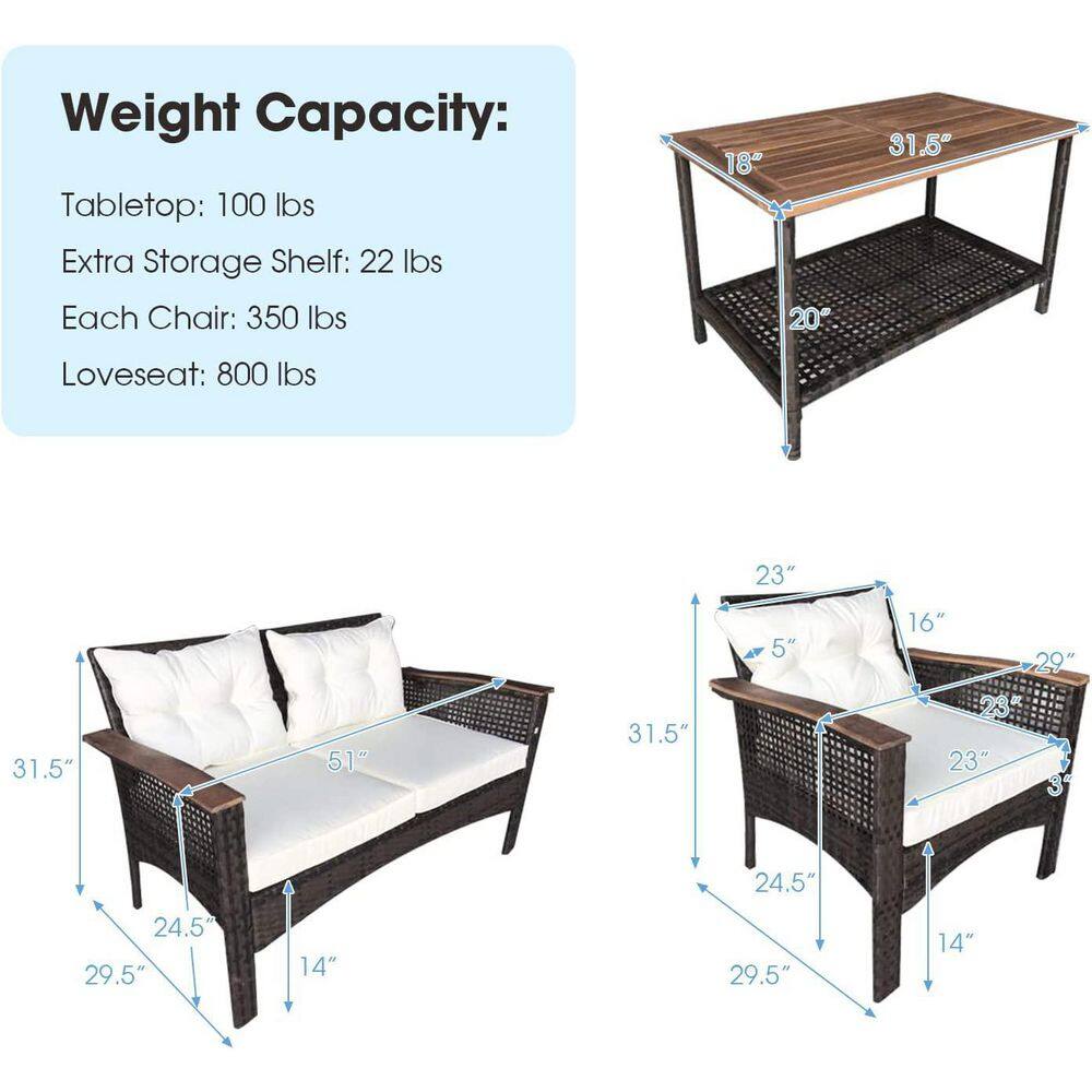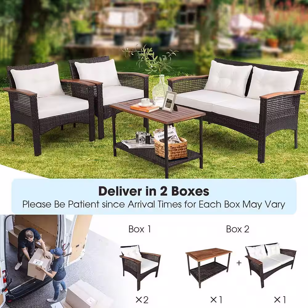 Alpulon 4-Pieces Patio Rattan Acacia Wood Patio Conversation Set with White Cushions