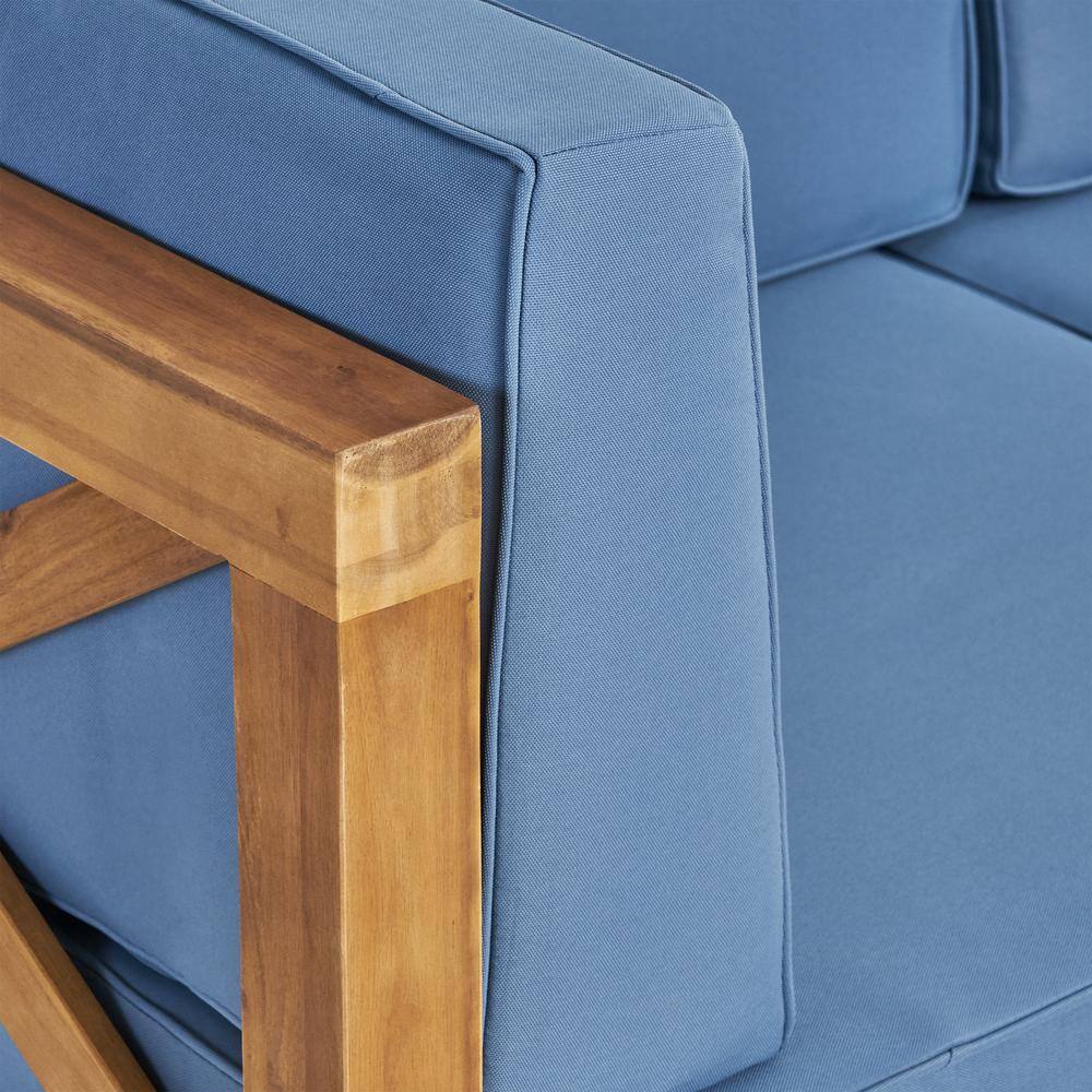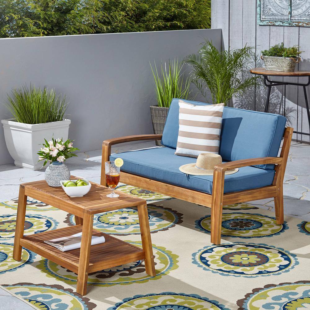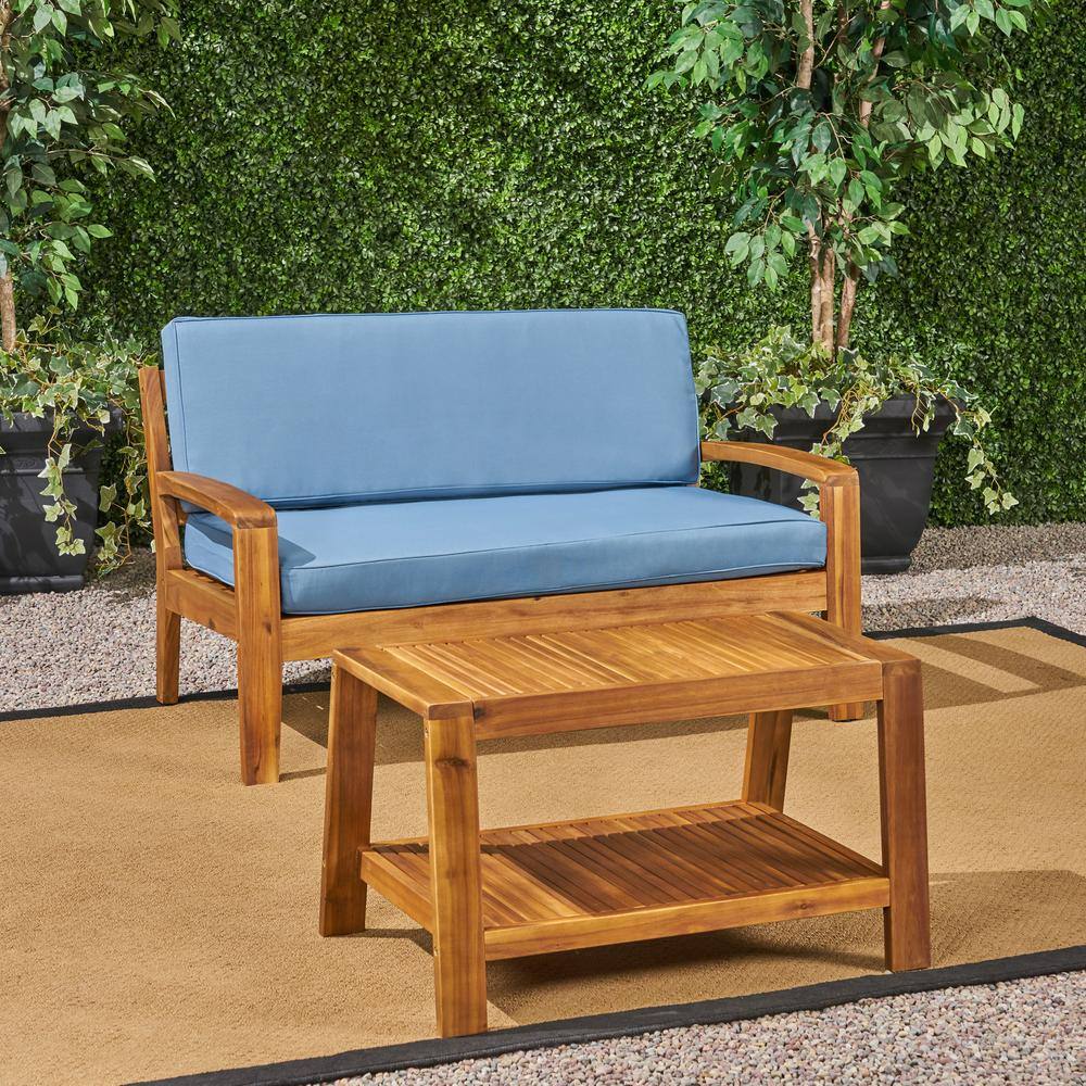 Noble House Grenada Teak Brown 2-Piece Wood Patio Conversation Set with Blue Cushions
