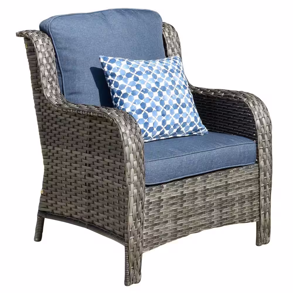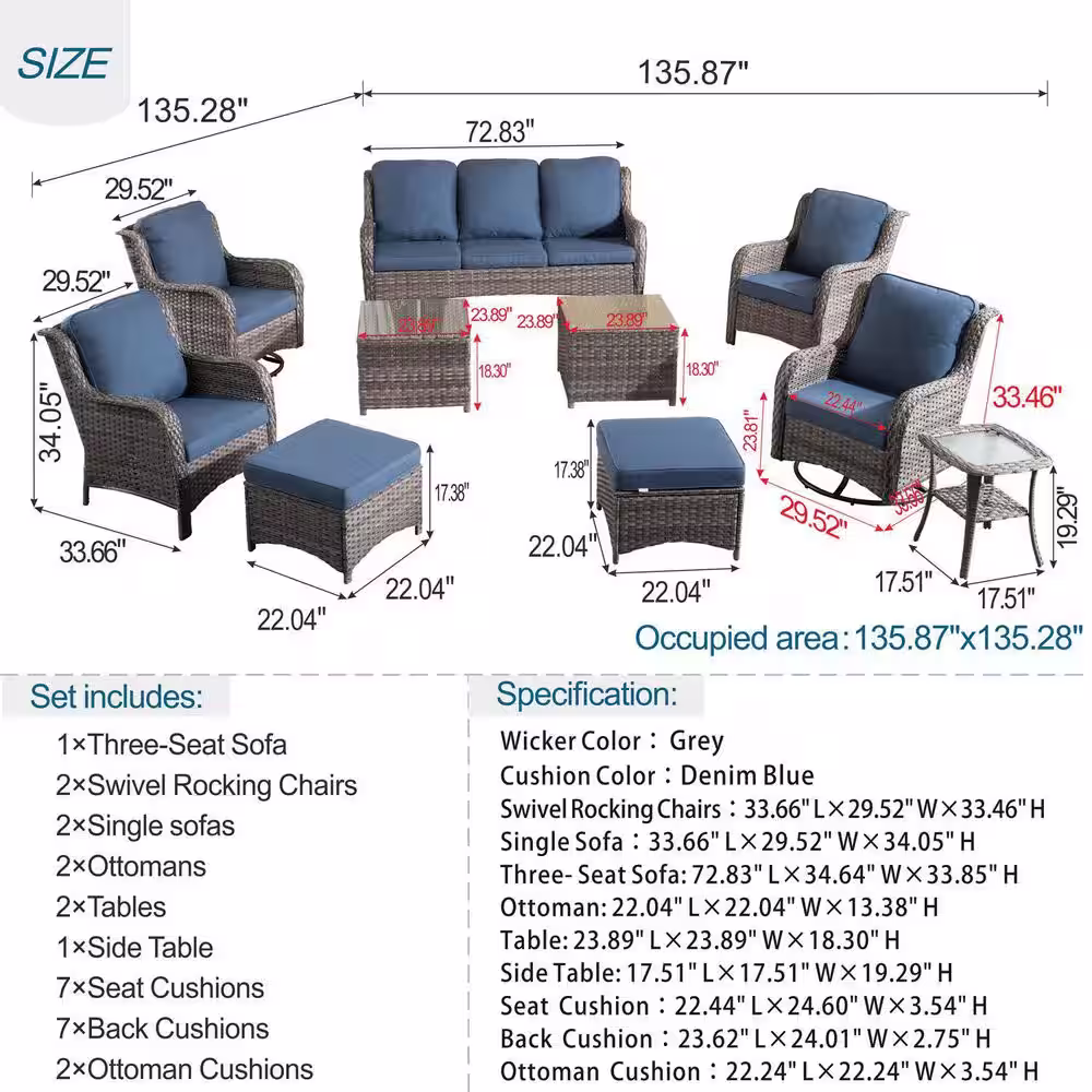 OVIOS New Kenard Gray 10-Piece Wicker Patio Conversation Set with Denim Blue Cushions and Swivel Rocking Chairs