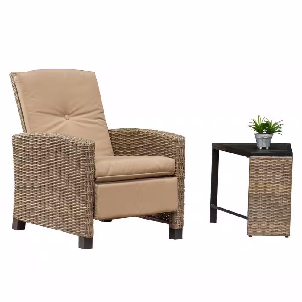 None Brown 2-Piece Wicker Outdoor Bistro Recliner Set with Khaki Cushions