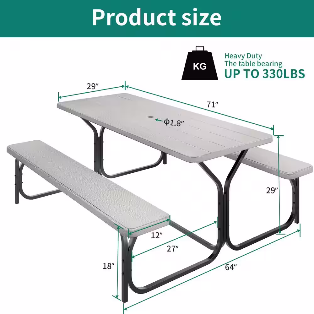 None 6-Person Patio Solid Wood Picnic Table Set with 2 Inch Umbrella Hole