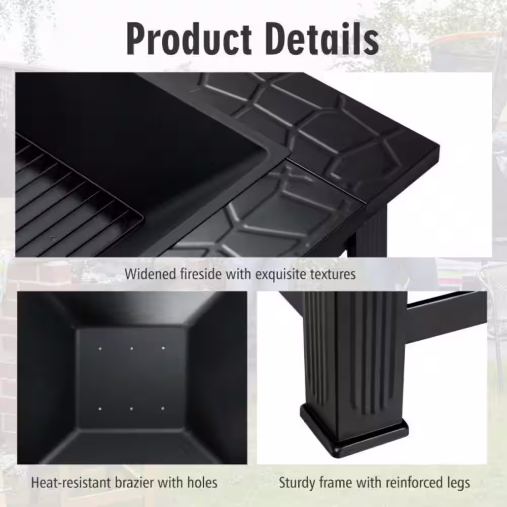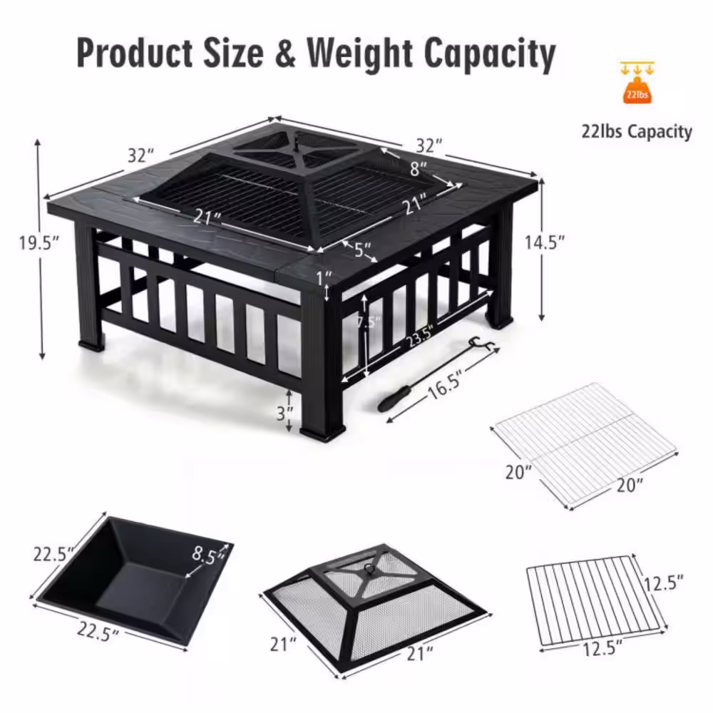 Clihome Black 32 in. 3-in-1 Square Outdoor Fire Pit Table with BBQ Grill and Rain Cover for Camping