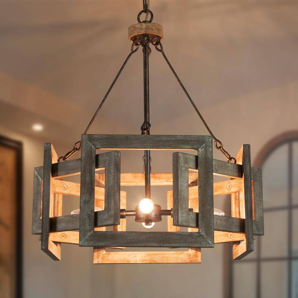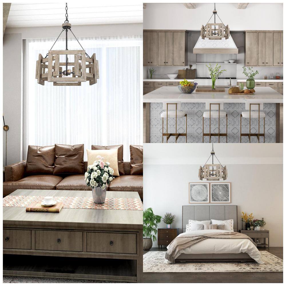 Uolfin Wood Chandelier, Farmhouse 4-Light Wood Island Drum Rustic Metal Chandelier Dining Room Ceiling Light