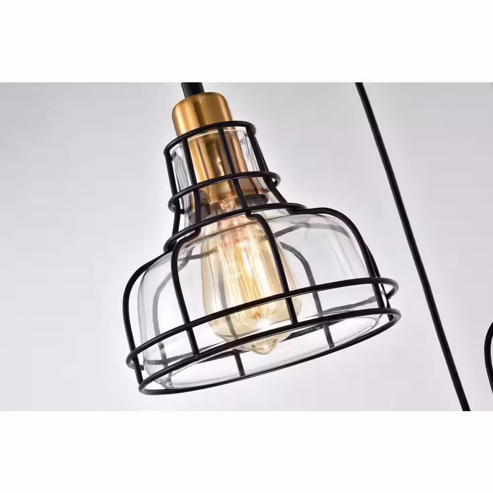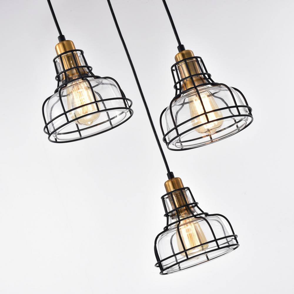 Edvivi Paris 3-Light Industrial Black and Antique Gold Pendant with Clear Glass Shade and Black Cage