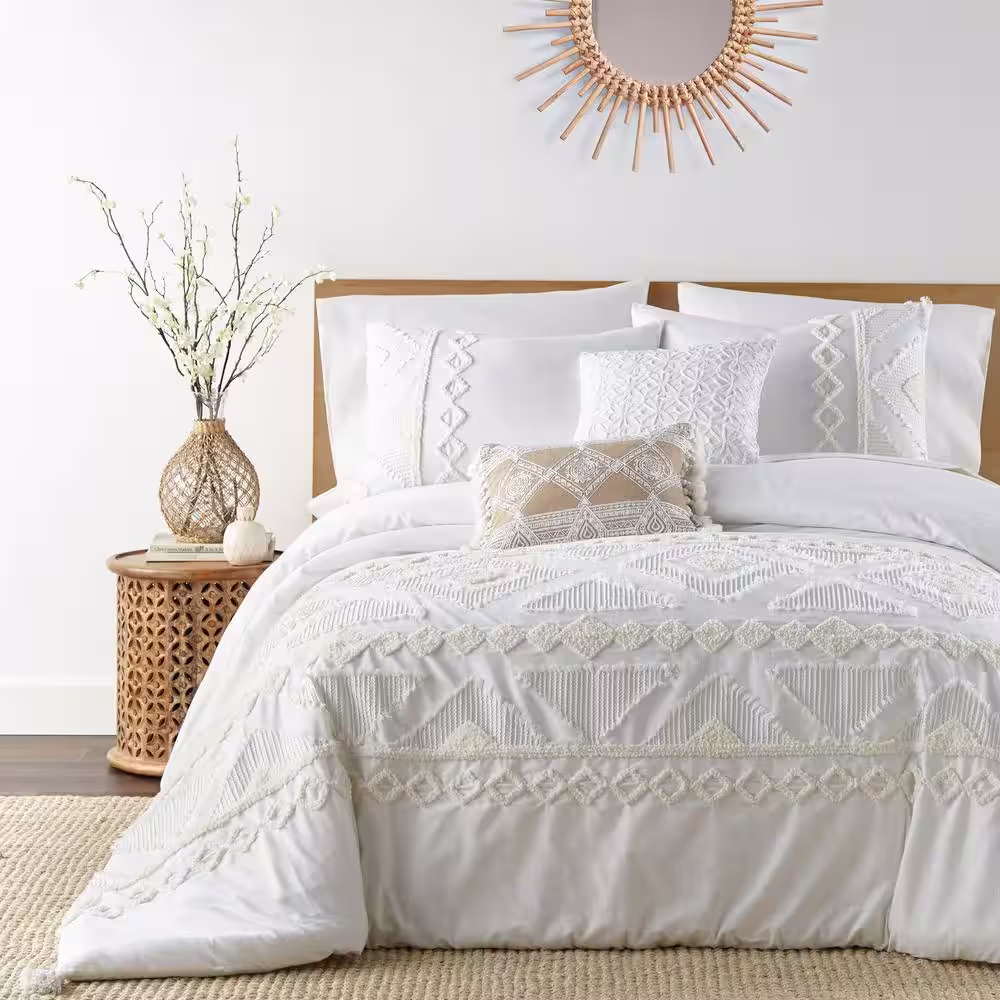 None Harleson White, Cream Geometric Tufted Frayed Linen Front/Cotton Back Euro Sham