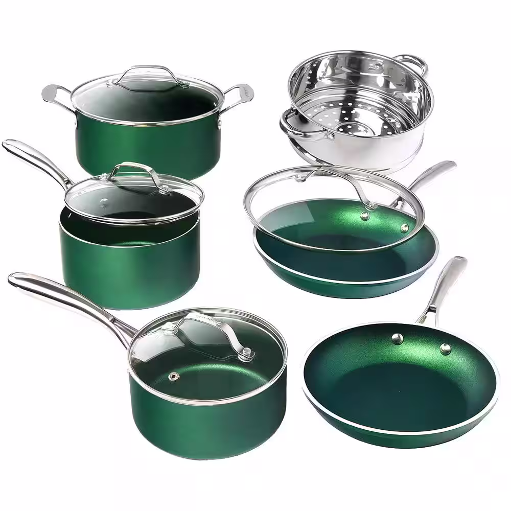 GRANITESTONE Emerald Green10-Piece Aluminum Ultra-Durable Non-Stick Diamond Infused Cookware Set with Glass Lids