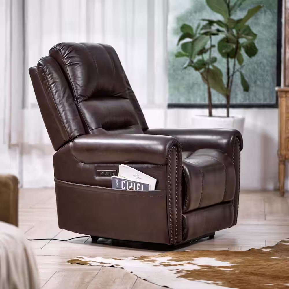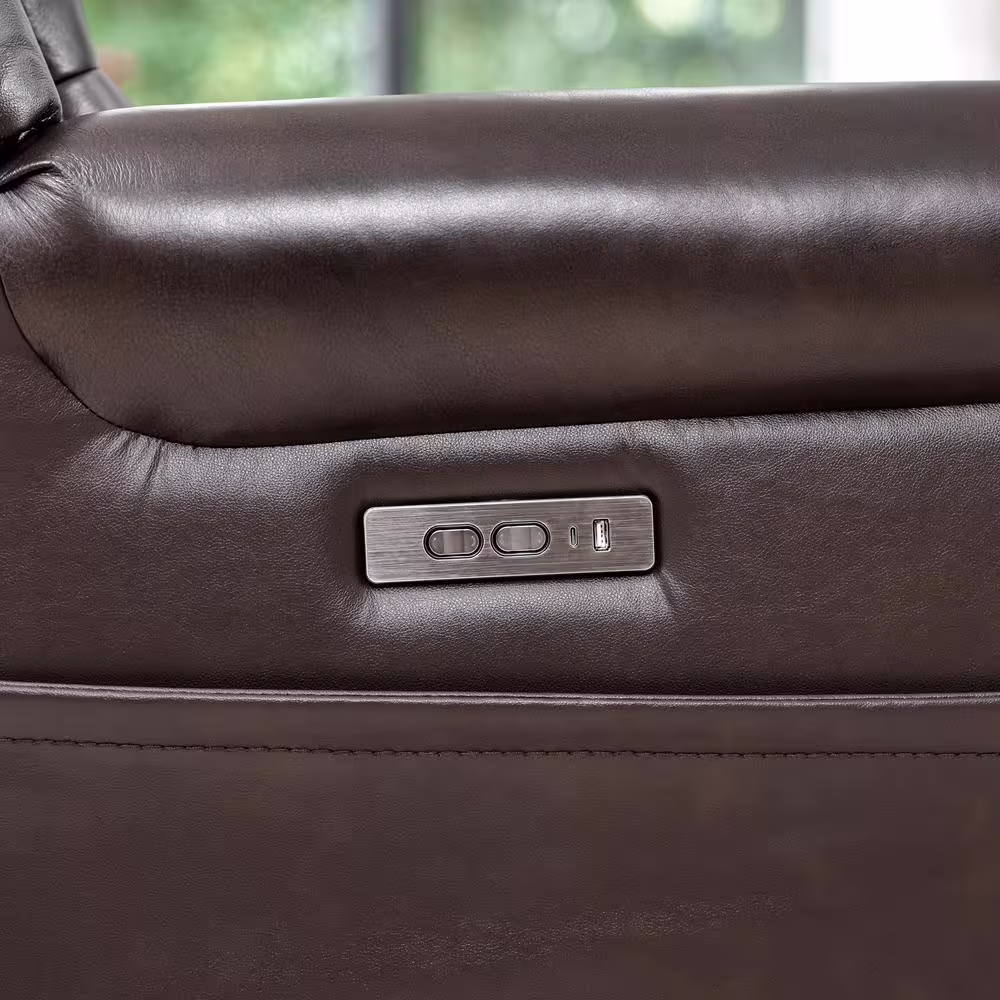 None 35.25 in. W Brown Genuine Leather Power Reclinr with Power Headrest USB Type C Charger