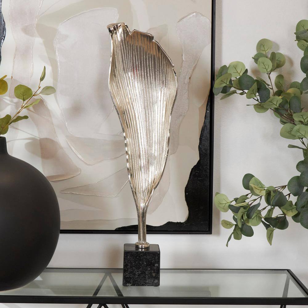 Litton Lane Silver Aluminum Textured Leaf Abstract Sculpture with Black Marble Base