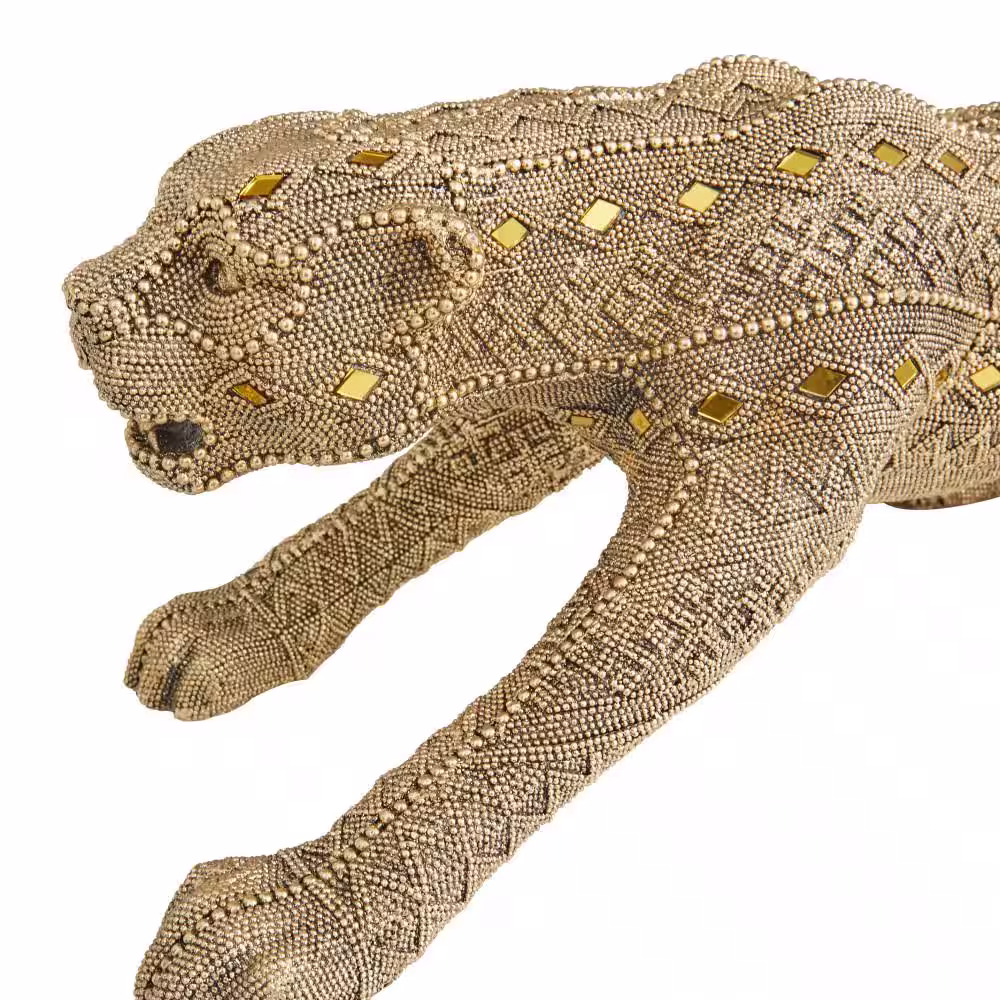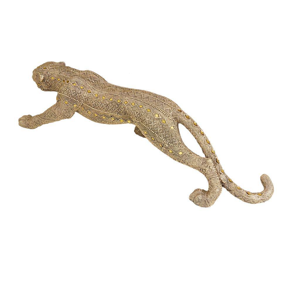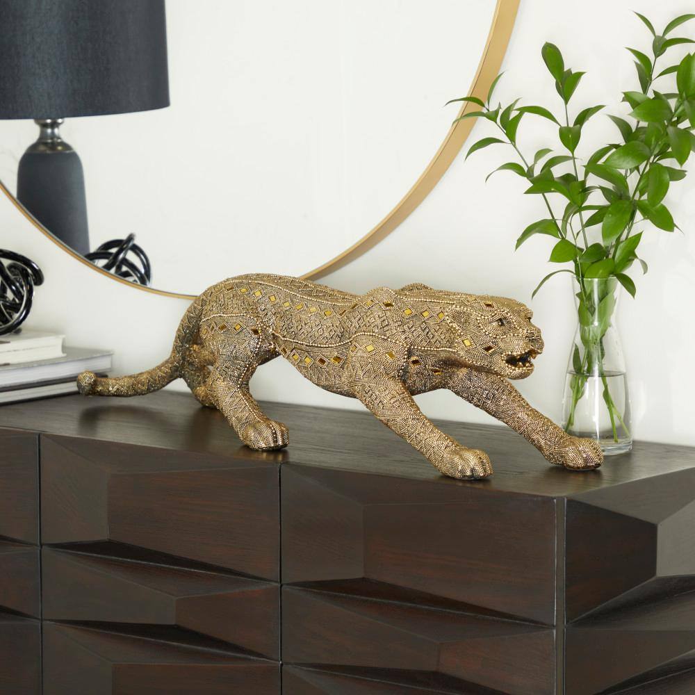 Litton Lane Gold Polystone Carved Encrusted Beading Leopard Sculpture with Diamond Shaped Mirrored Accent